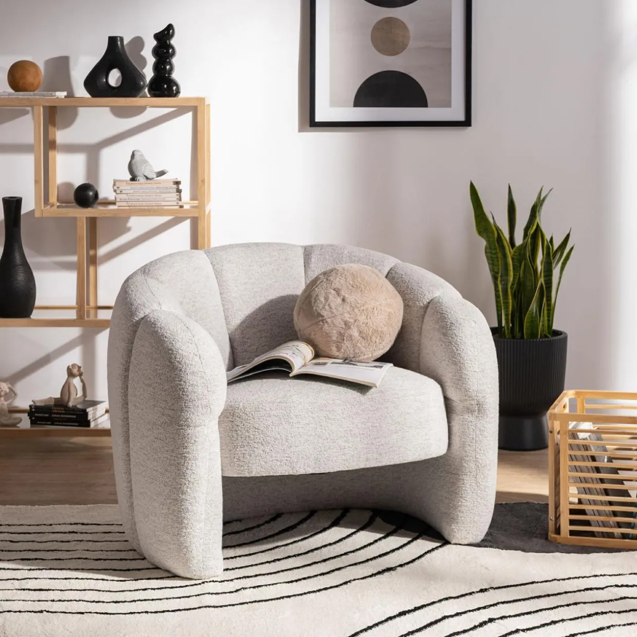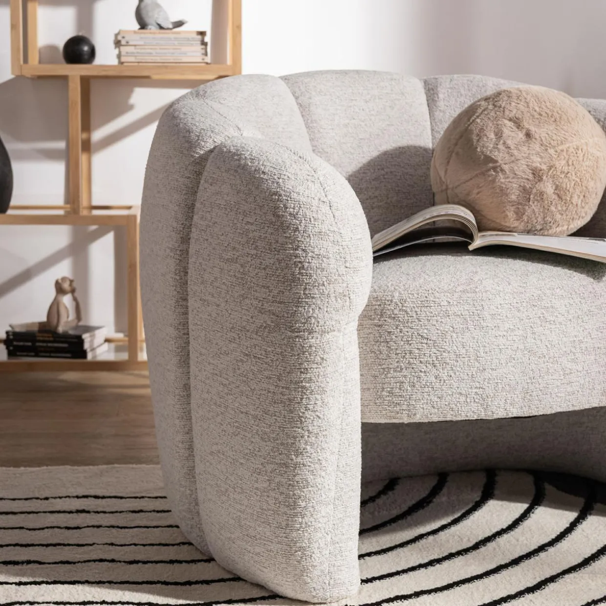 Jasnoszary fotel MANUL z pionowymi przeszyciami w kształcie muszli to wyrazisty element, który przyciąga wzrok i dodaje salonowi wyjątkowego charakteru. Dzięki zaokrąglonym liniom wprowadza przytulną atmosferę, a jego wymiary idealnie sprawdzą się nawet w mniejszych przestrzeniach.