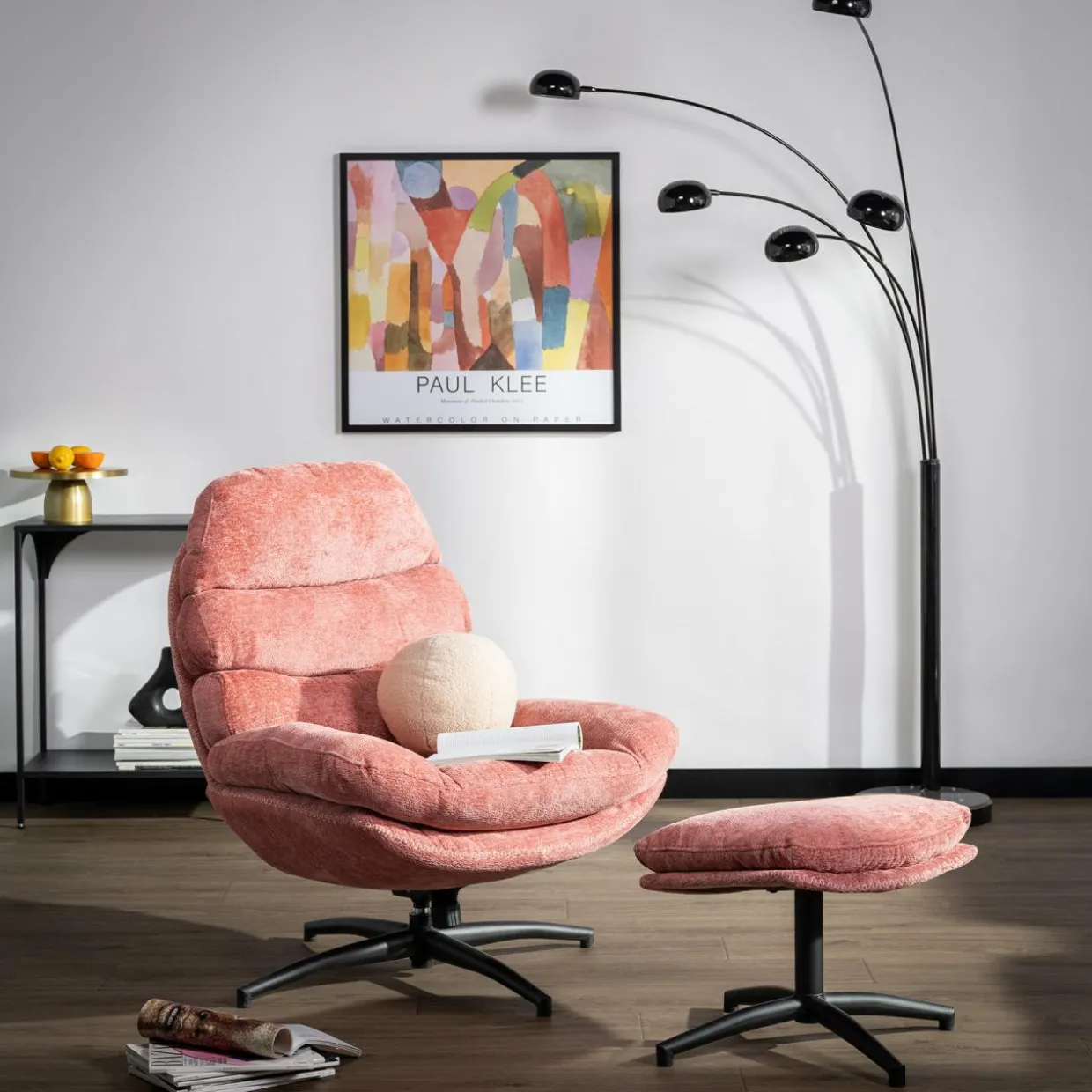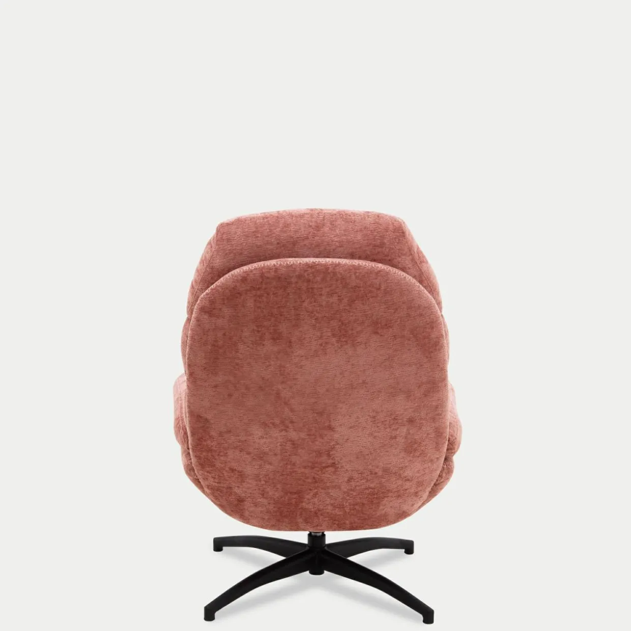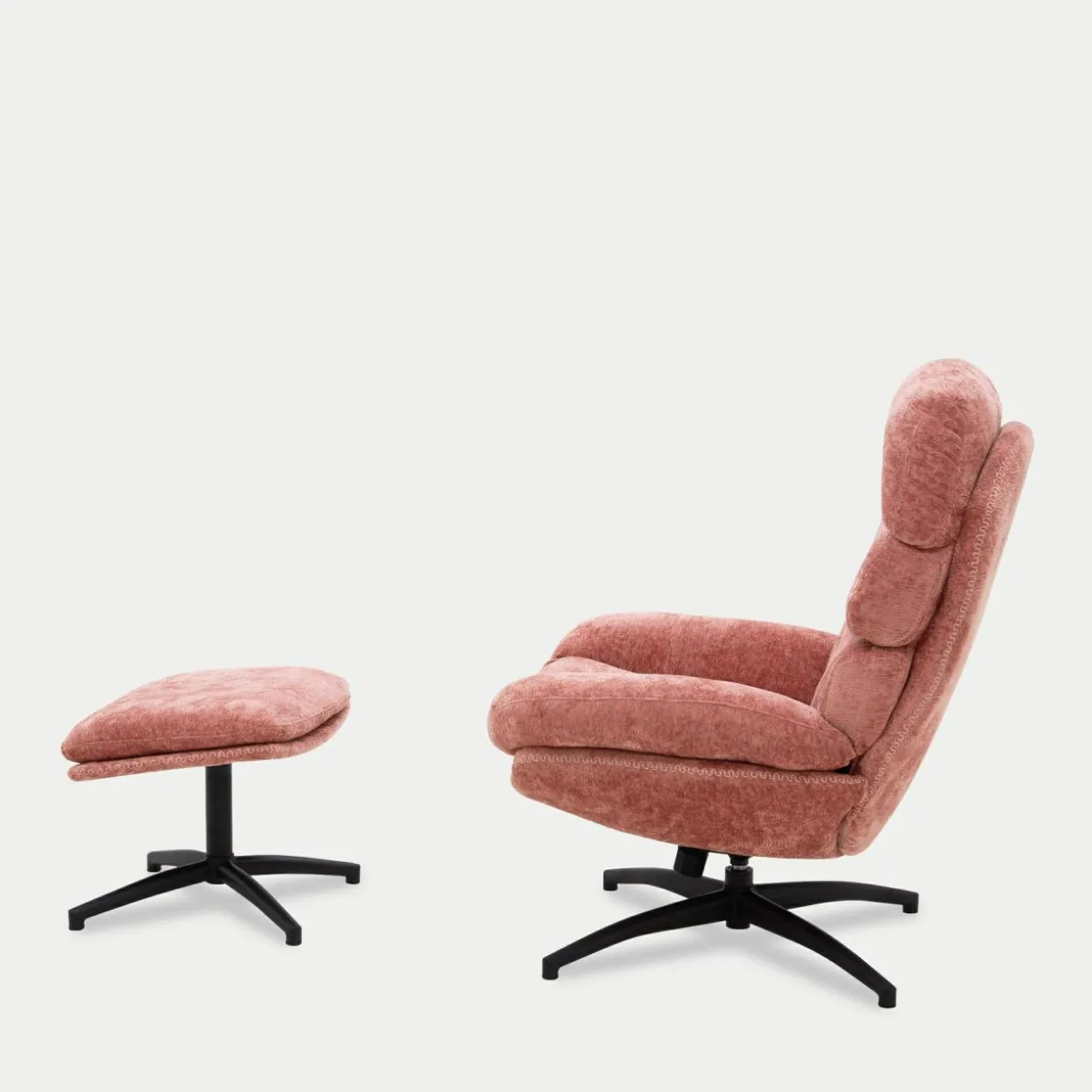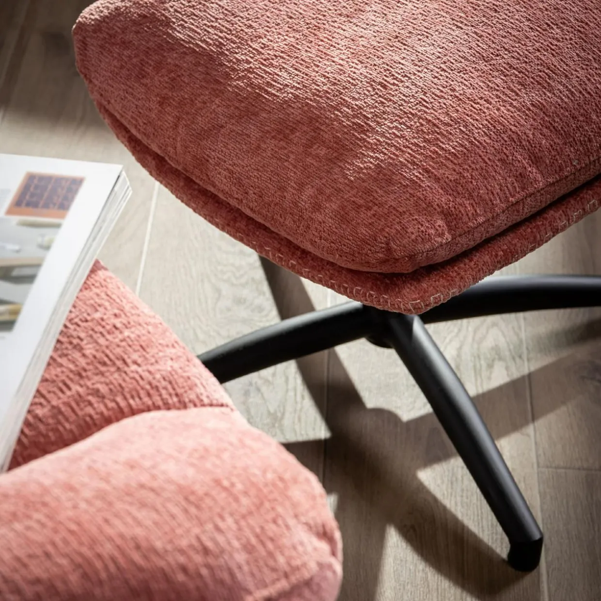 - Obicie fotela i podnóżka zostało wykonane z przyjemnej w dotyku tkaniny w kolorze różowym.
