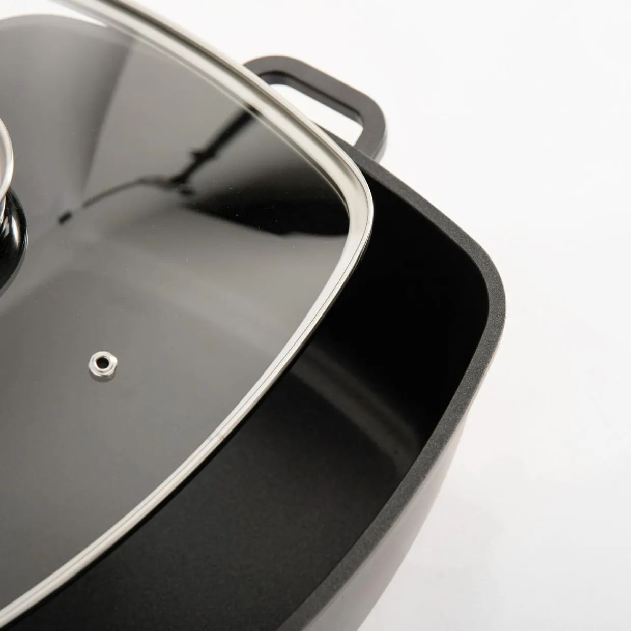 - Szklana pokrywa posiada aromatyzer. Wygodnie dolejesz płynu do potrawy. Uchwyt stopniowo dozuje płyn do środka garnka.
