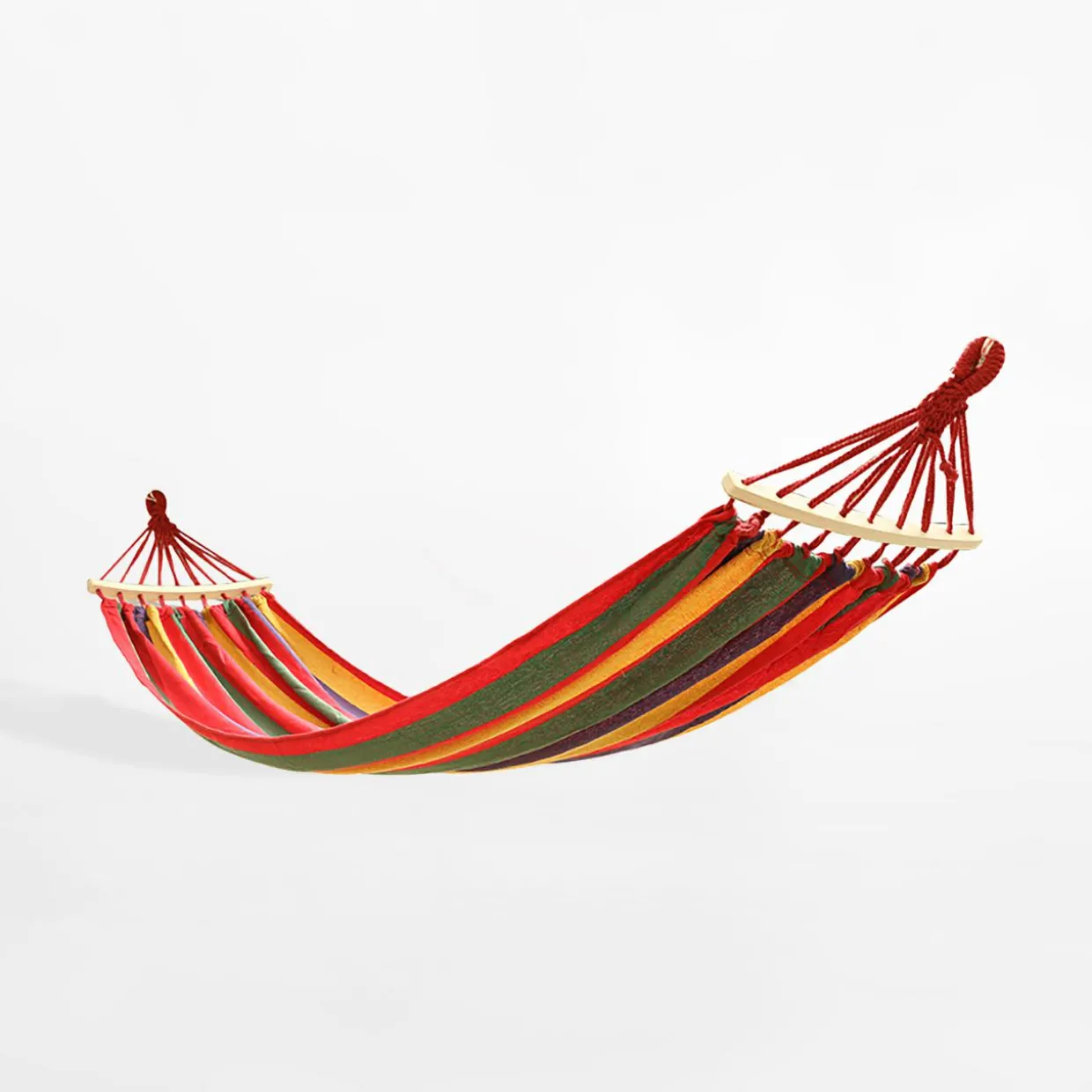 - Drewniane drążki u obu końców pomogą zachować szerokość materiału, a dzięki temu ułatwią wchodzenie i wychodzenie z hamaka.