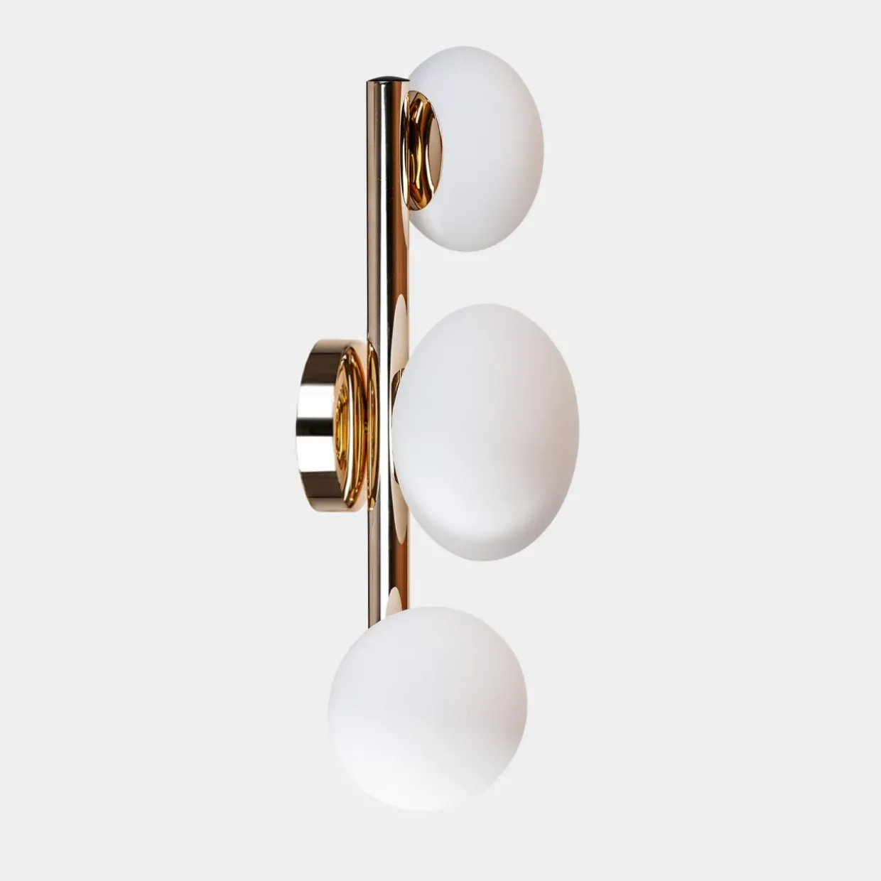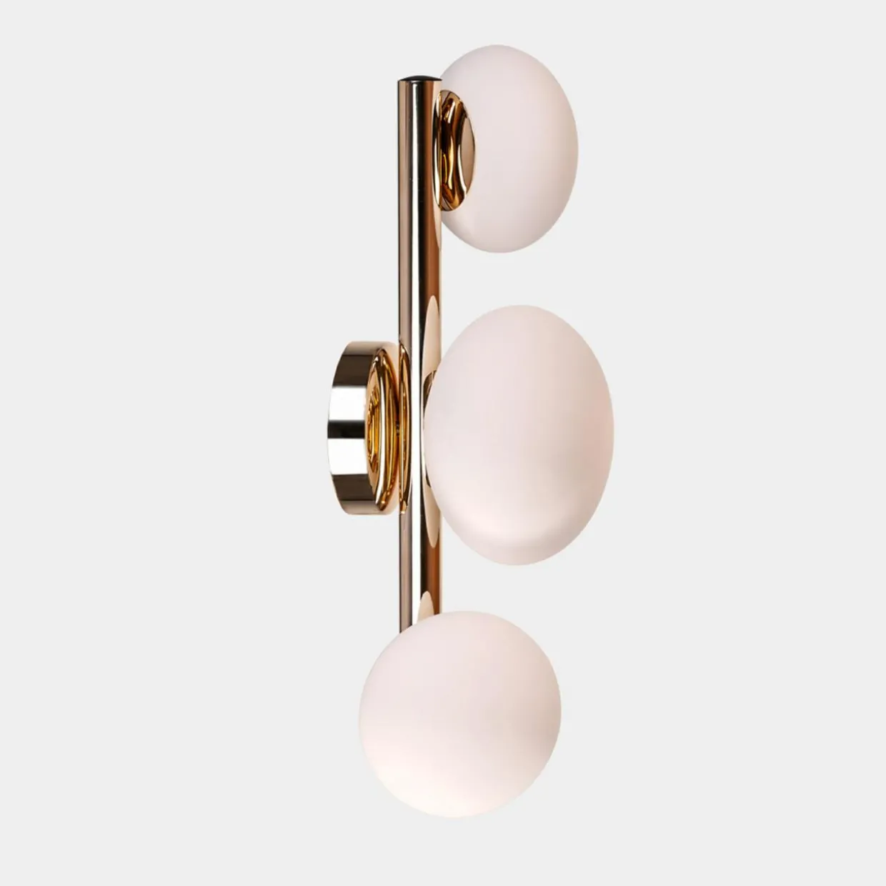 3 mlecznobiałe klosze połączone podstawą w złotym kolorze oświetlą i podkreślą charakterystyczne cechy pomieszczenia.