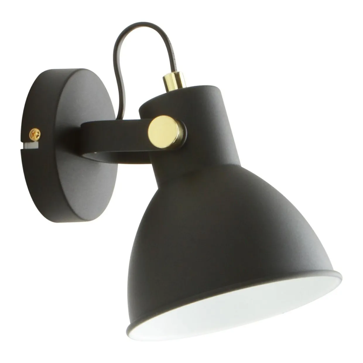 Znakiem szczególnym, podkreślającym oryginalność jest złota kolorystyka ramienia kinkietu i pierścień w górnej jego części. Całą resztę pokrywa matowa czerń, jedynie środek klosza jest wykończony na biało.