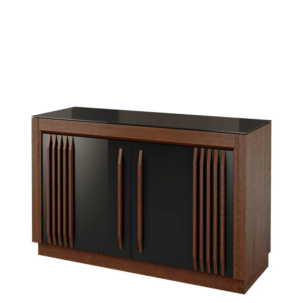 - Połączenie eleganckiej czerni, ciemnego drewna i podłużnych lameli sprawia, że komoda preentuje się elegancko.