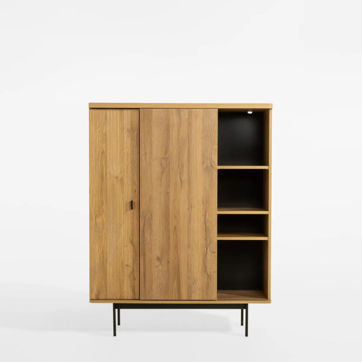Uporządkuj salon dzięki 2-drzwiowej komodzie LUCIA. Rzeczy nieprzeznaczone na widok schowasz za pełnymi drzwiami, zapewniając schludny wygląd pomieszczenia. Otwarte półki pozwolą Ci wyeksponować ulubione pamiątki z wakacji.