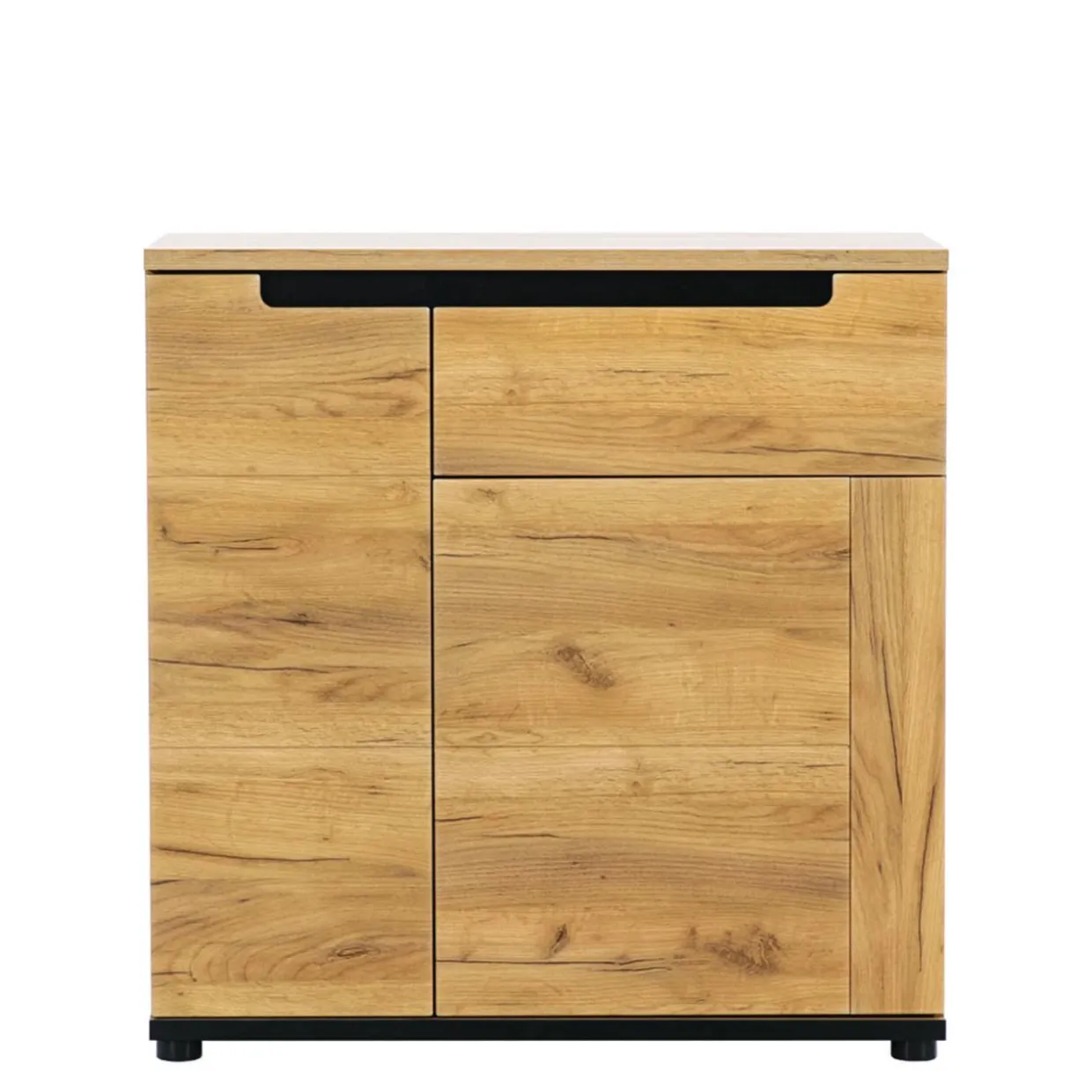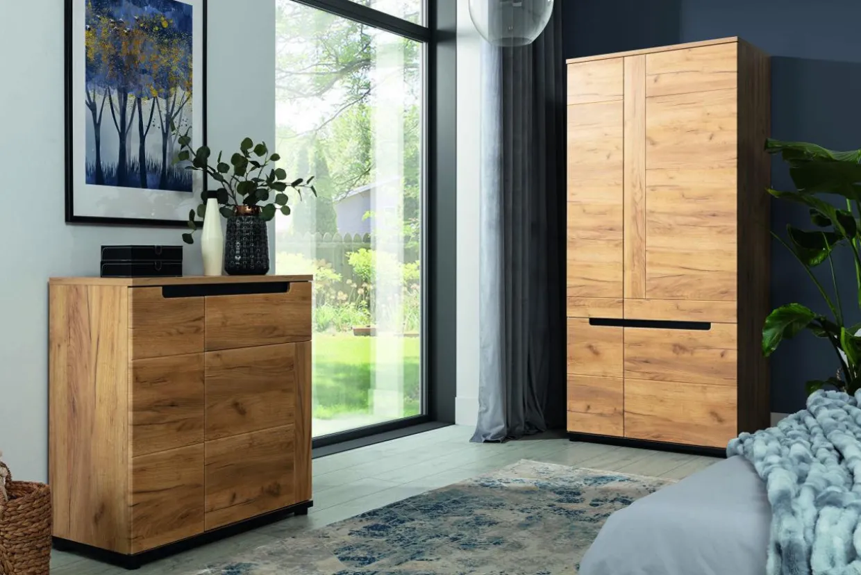 Nowoczesny design komody PRISCO cechują wyważone elementy dekoracyjne oraz kolorystyka, która łączy wybarwienie dąb craft złoty z czarnym kolorem.