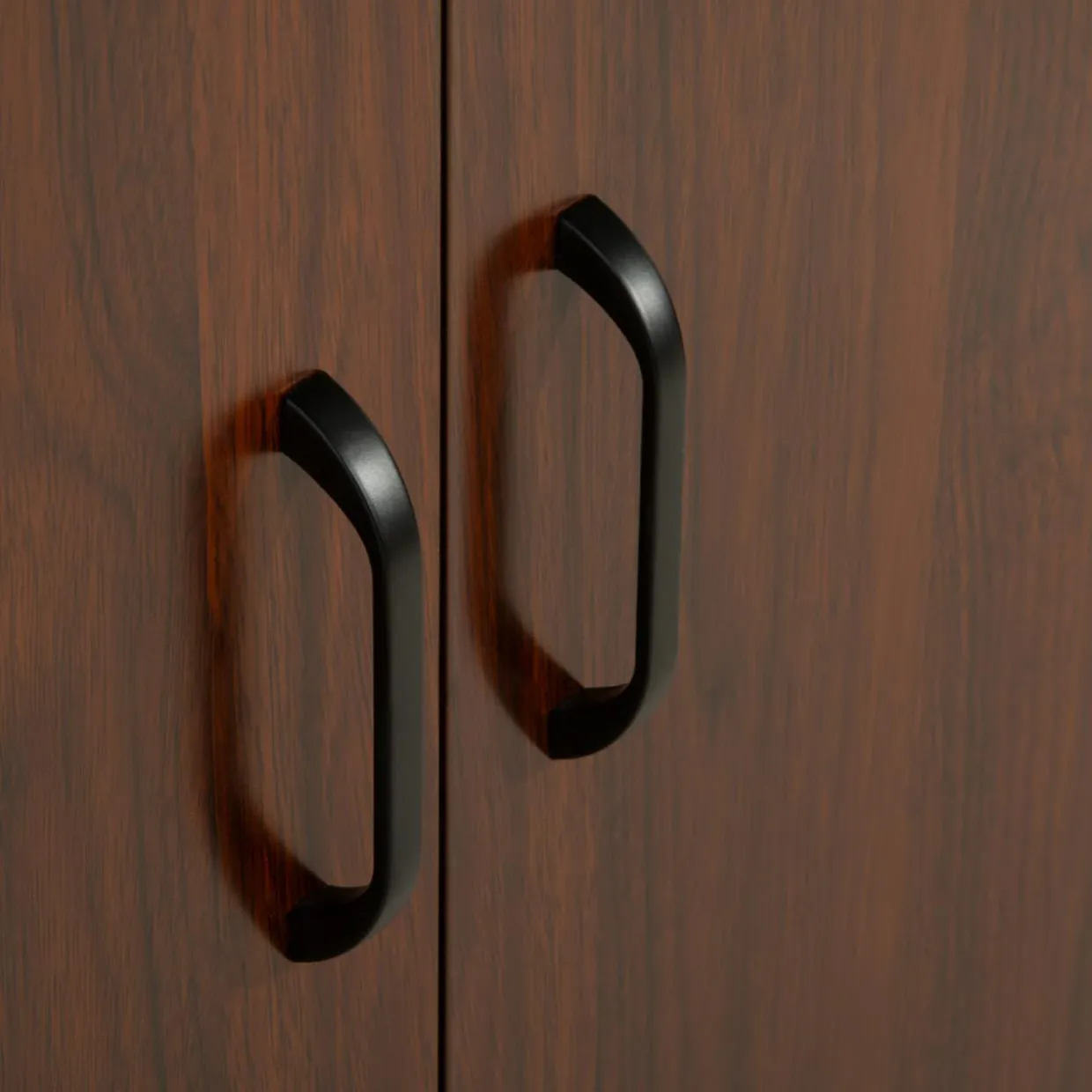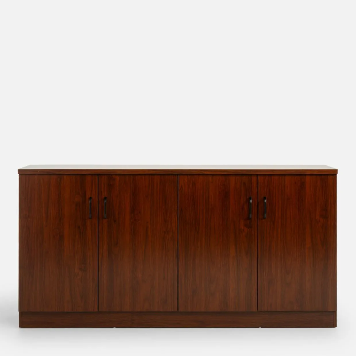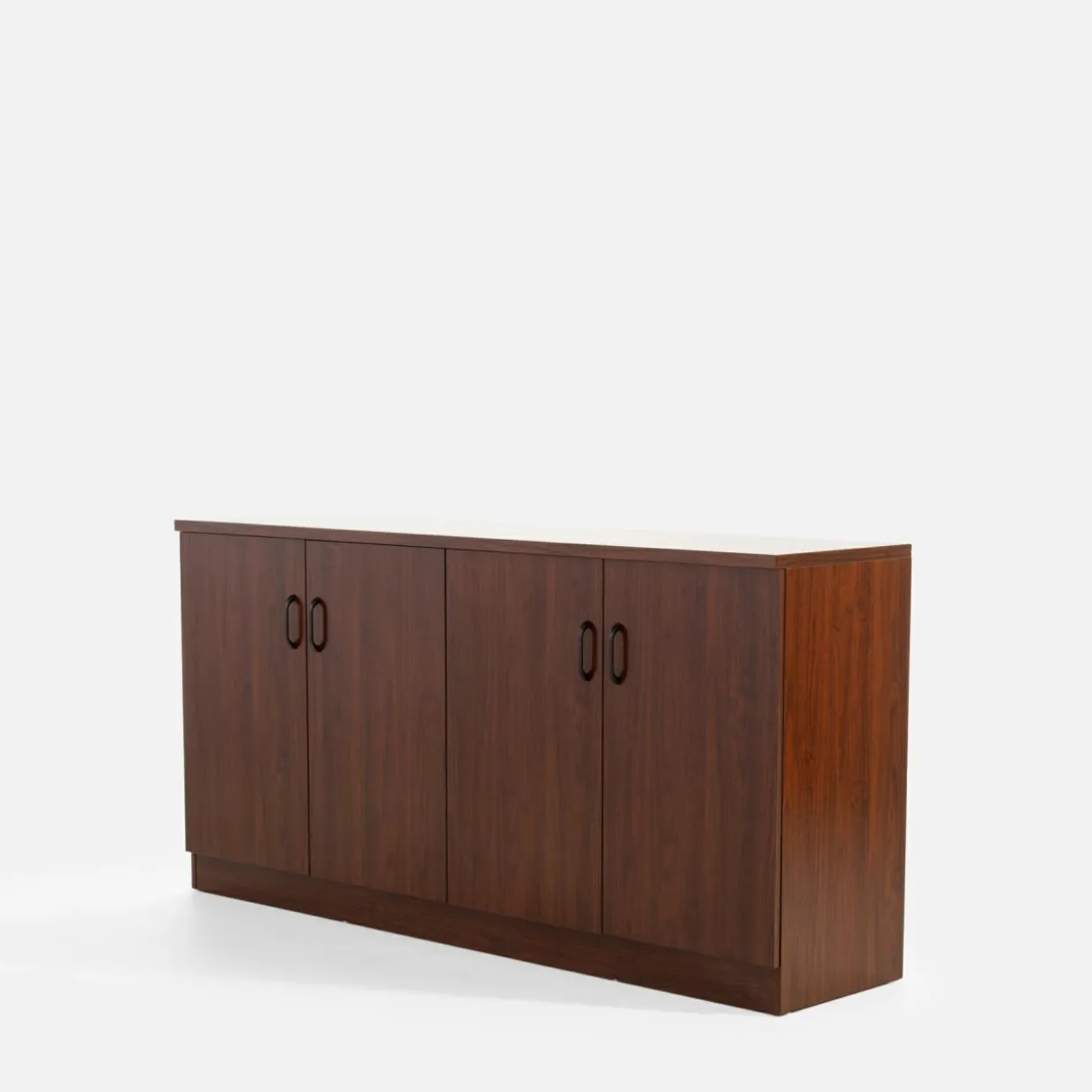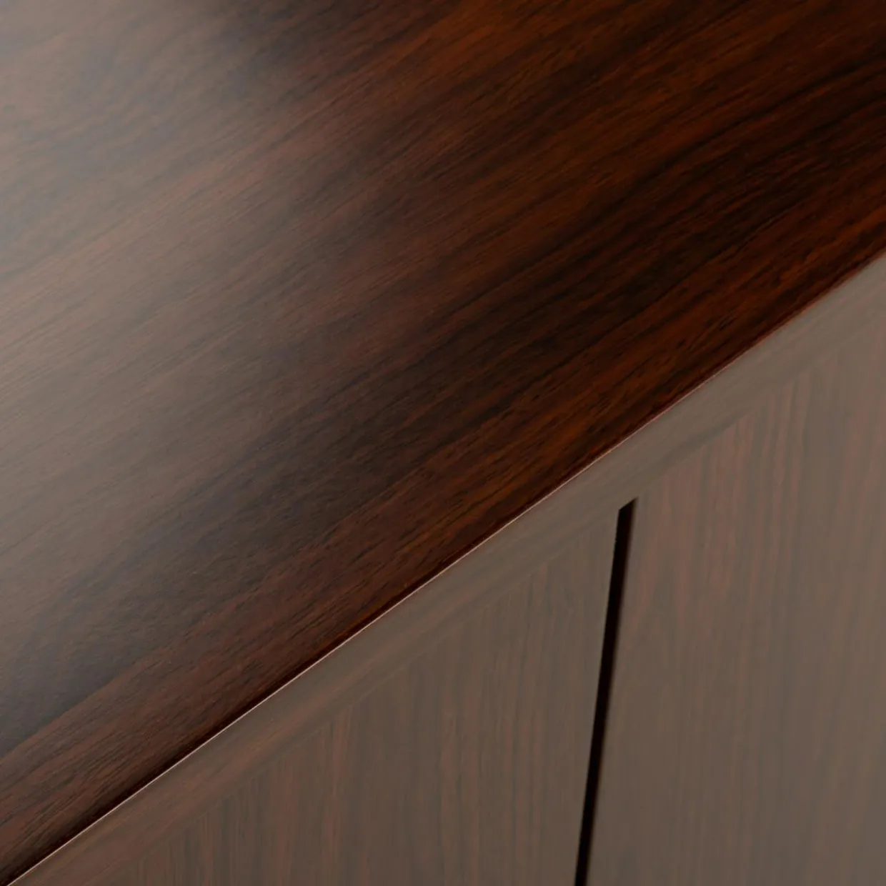 Wykończenie mebli w kolorze czerwonego orzecha prezentuje się elegancko – dzięki ciemnemu odcieniu imitacji drewna kolekcja stworzy profesjonalną i przyjazną atmosferę, idealną do prowadzenia spotkań biznesowych i konferencji. Proste linie mebli i minimalistyczne uchwyty podkreślają ich funkcjonalność.
