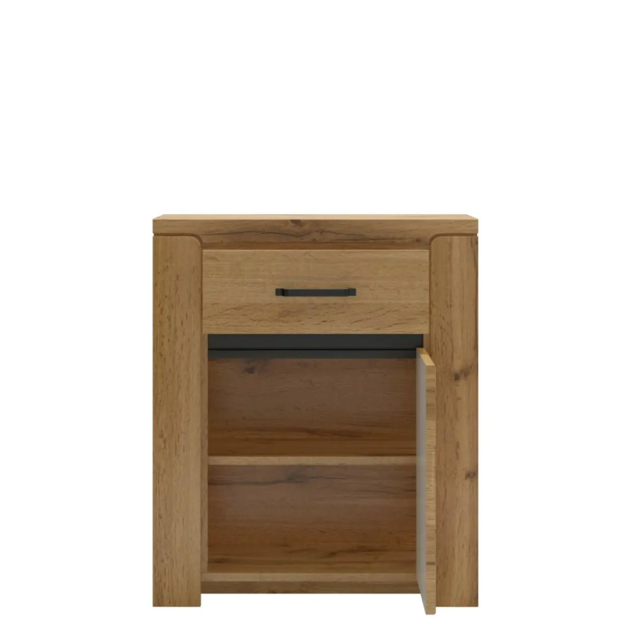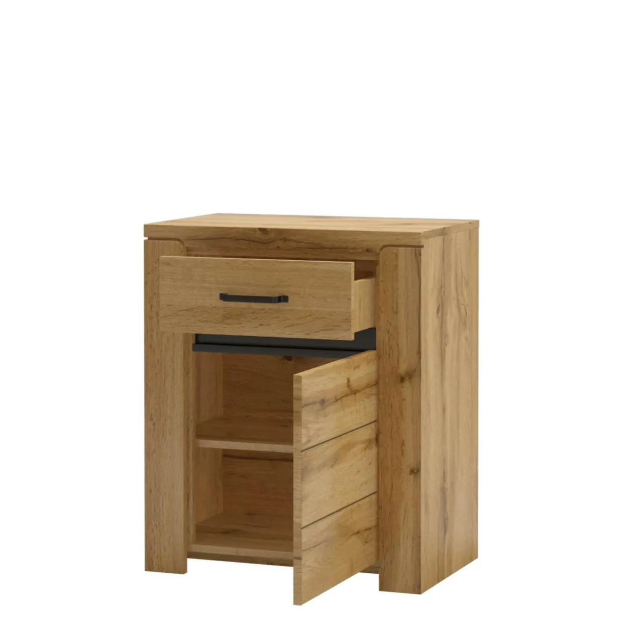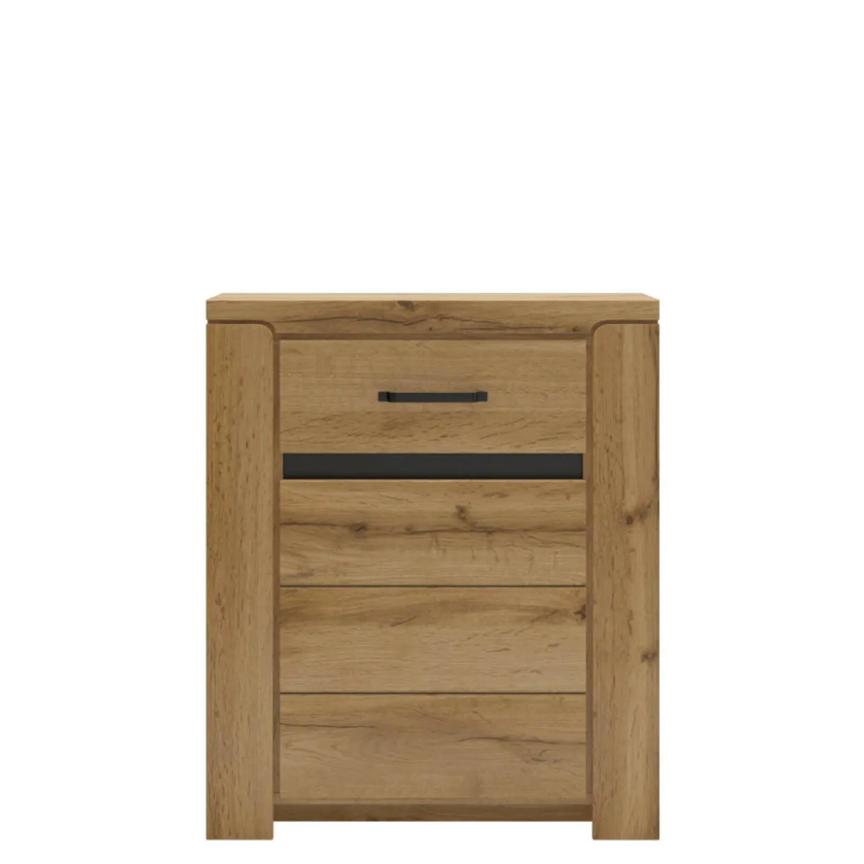 Komoda łączy cechy rustykalnego mebla z nowoczesnymi elementami wykończeniowymi. Wraz z pozostałymi meblami z serii, tworzy aranżację o sielskim charakterze, wprowadzając do wnętrz przytulny klimat. Ze względu na dużą różnorodność brył, meble te można wkomponować w otwarte, wielofunkcyjne przestrzenie.