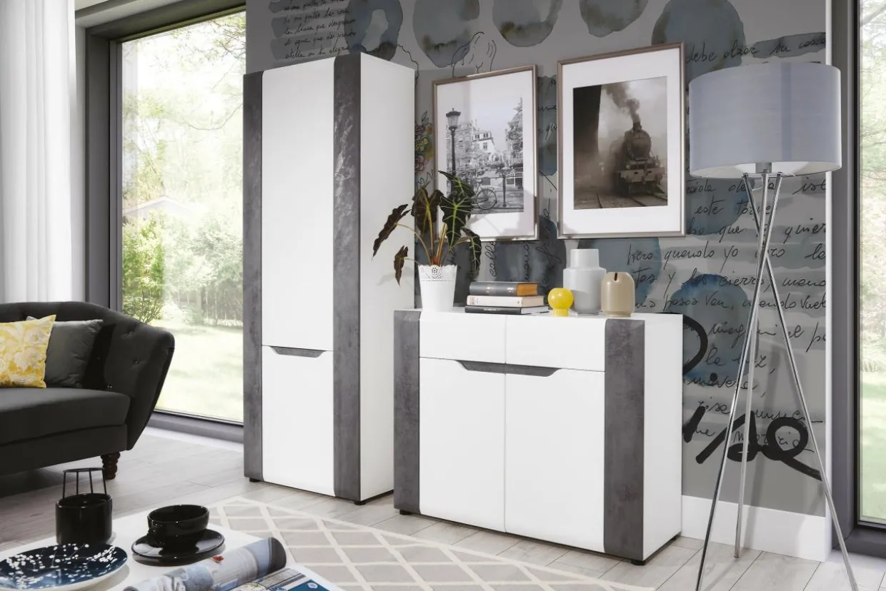 Korpus oraz blaty mebla zostały wykonane z laminowanej płyty meblowej, natomiast fronty to MDF z wykończeniem w białym połysku. Modne zestawienie bieli oraz szarości betonu dodaje komodzie BRANDO nieco surowości złagodzonej poprzez linię podchwytów we frontowej części mebla.