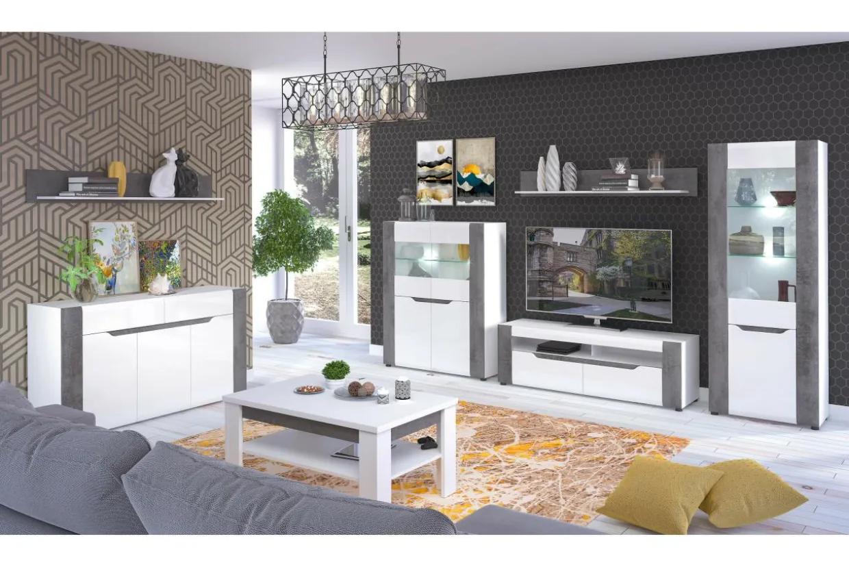 Korpus oraz blaty mebla zostały wykonane z laminowanej płyty meblowej, natomiast fronty to MDF z wykończeniem w białym połysku. Modne zestawienie bieli oraz szarości betonu dodaje komodzie BRANDO nieco surowości złagodzonej poprzez linię podchwytów we frontowej części mebla.