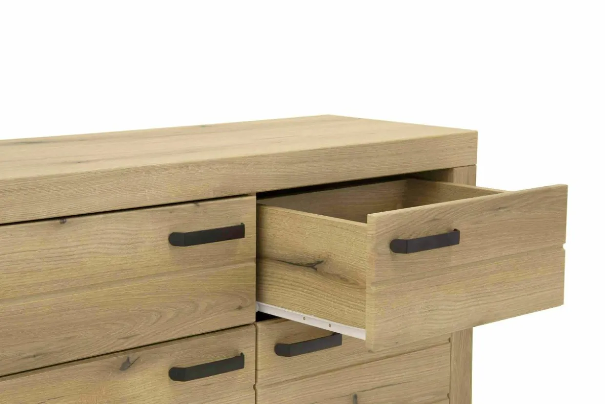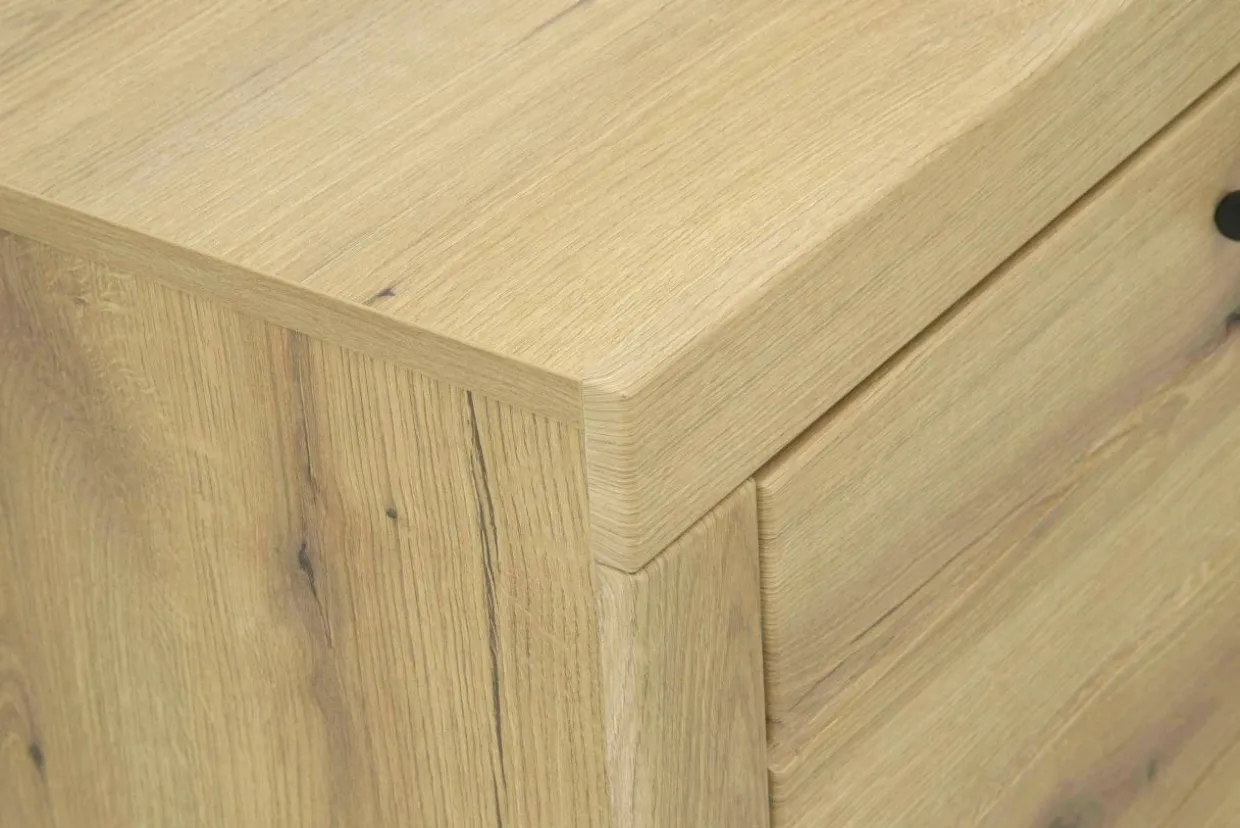 - Komoda wykończona jest laminatem oraz folią, imitującymi naturalny dąb w odcieniu Coast Evoke.
