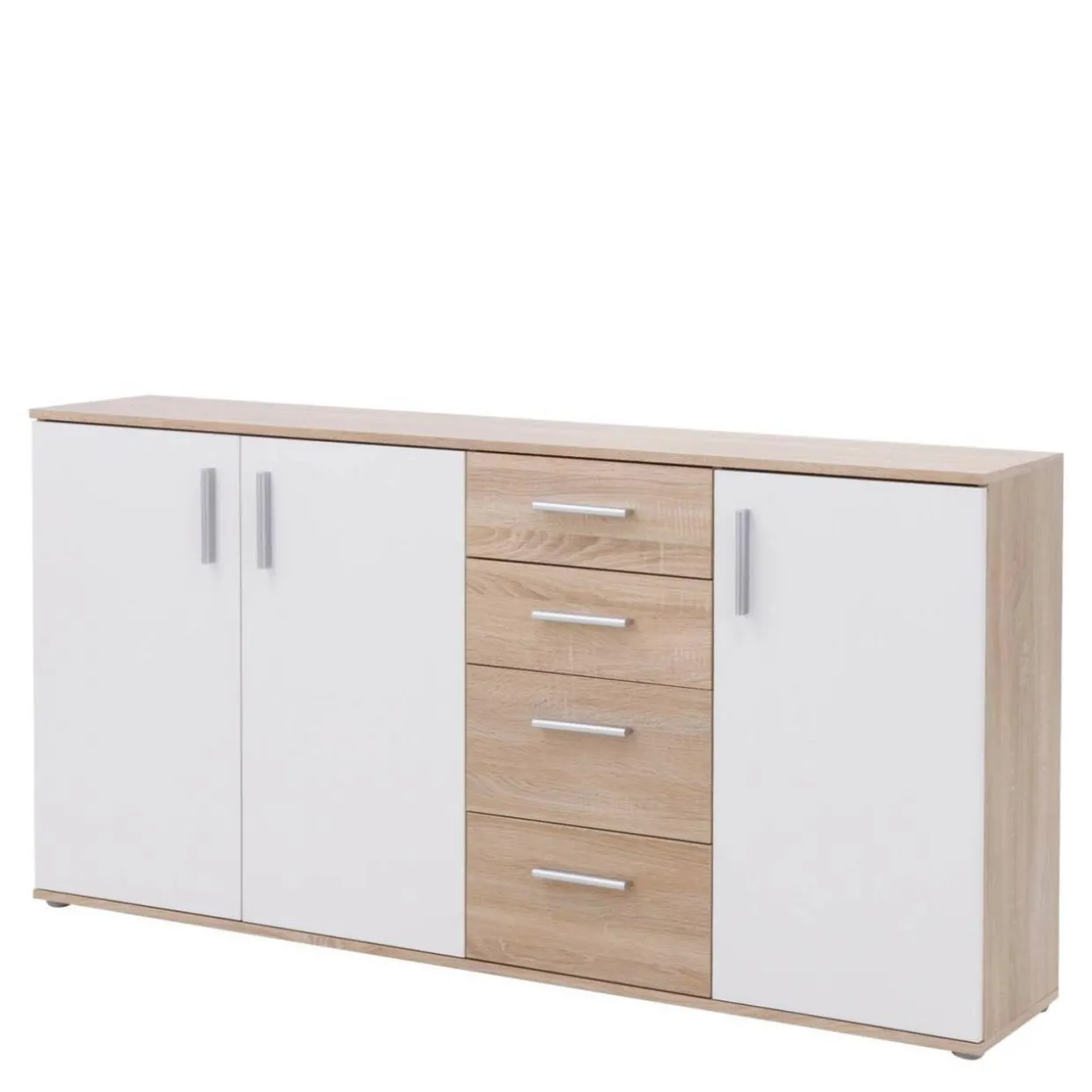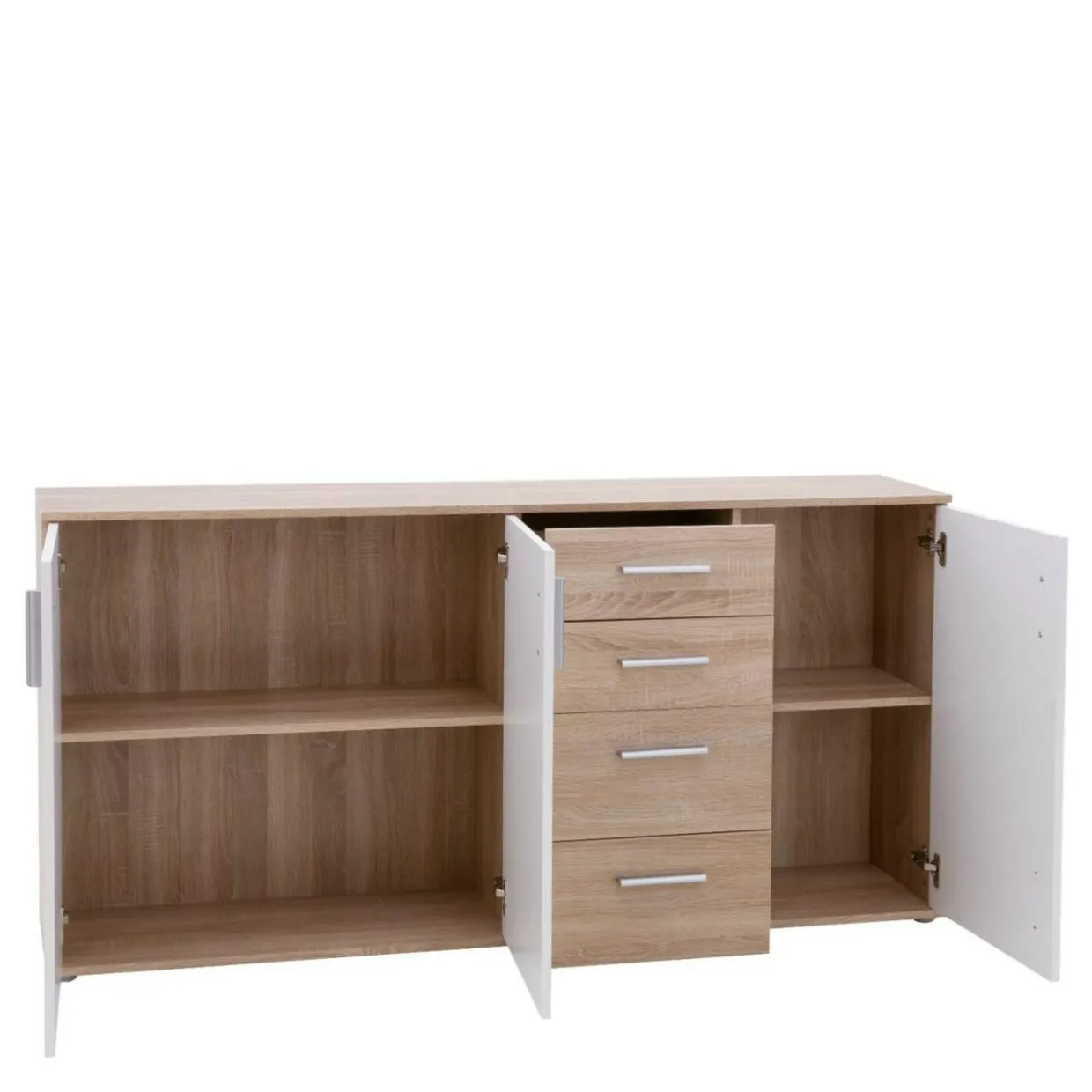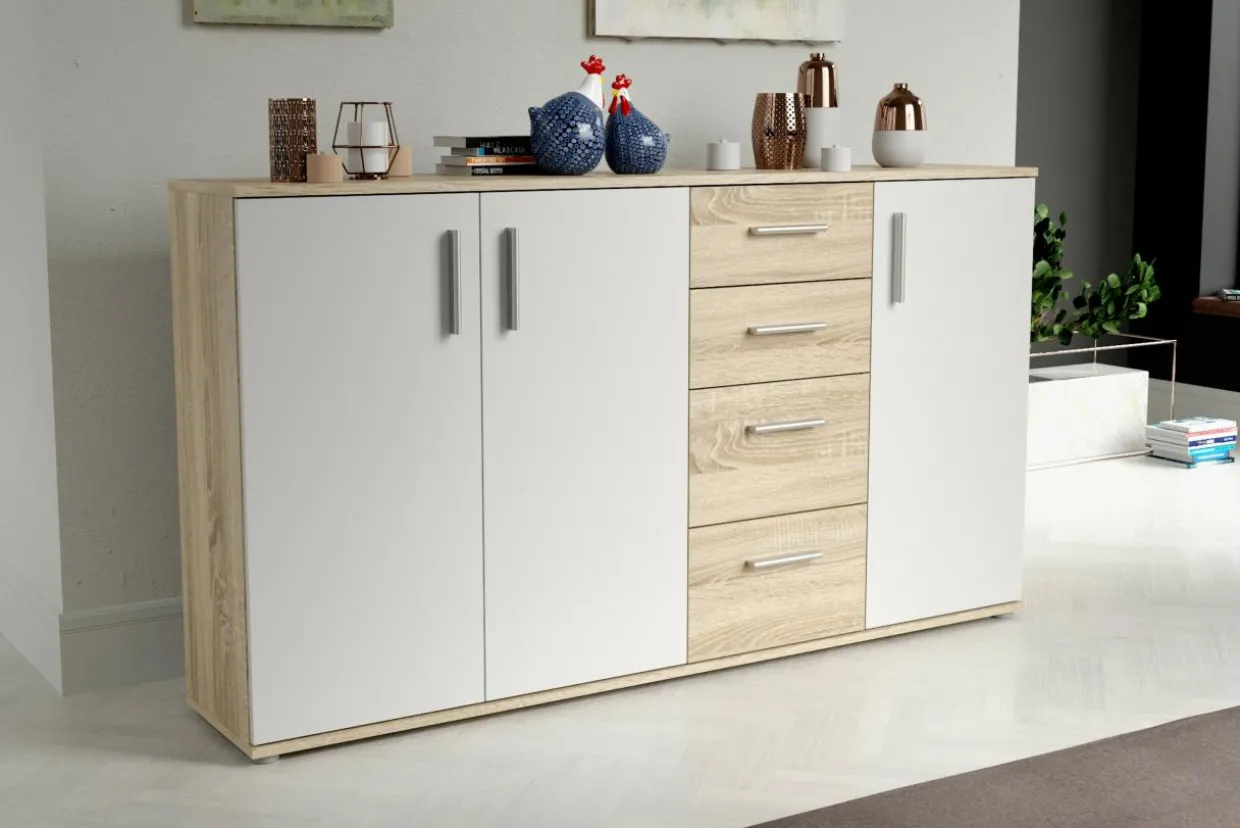 - Komoda jest pokryta folią w ciekawym połączeniu barwy dębu sonoma oraz klasycznej bieli. Powierzchnia pokryta folią jest bardzo praktyczna – jest trwała i łatwa do utrzymania w czystości;