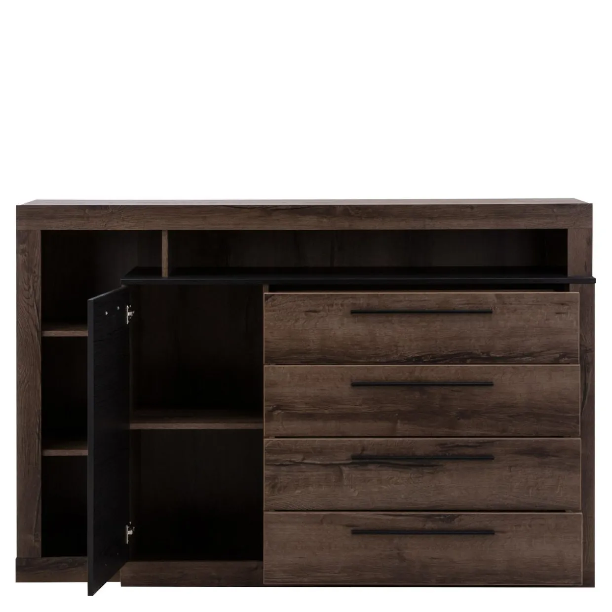 Duża komoda do sypialni RECOVER ułatwi Ci funkcjonalne wyposażenie wnętrza. Oryginalna konstrukcja mebla pozwoli uzyskać wyjątkowy efekt. Połączenie kolorów dąb szlachetny i dąb czarny dodaje stylu.