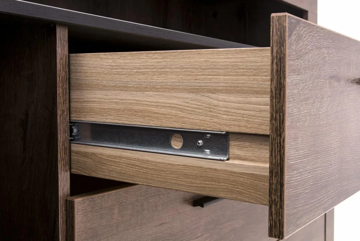 Ciemna wstawka na froncie oraz ergonomiczne uchwyty podkreślają charakter mebla.