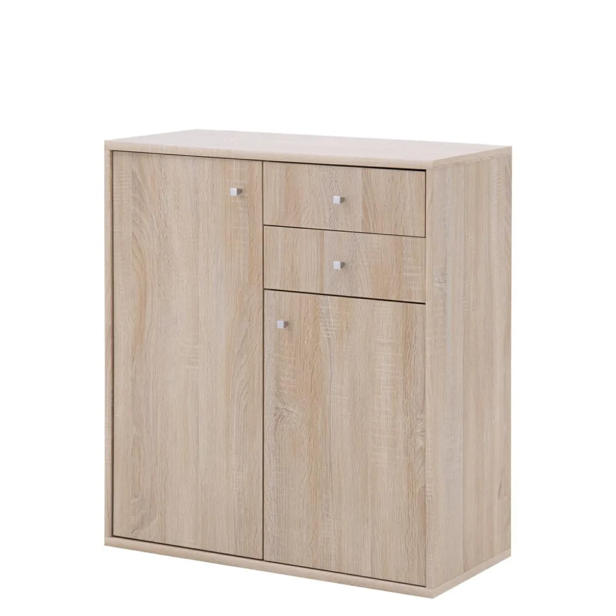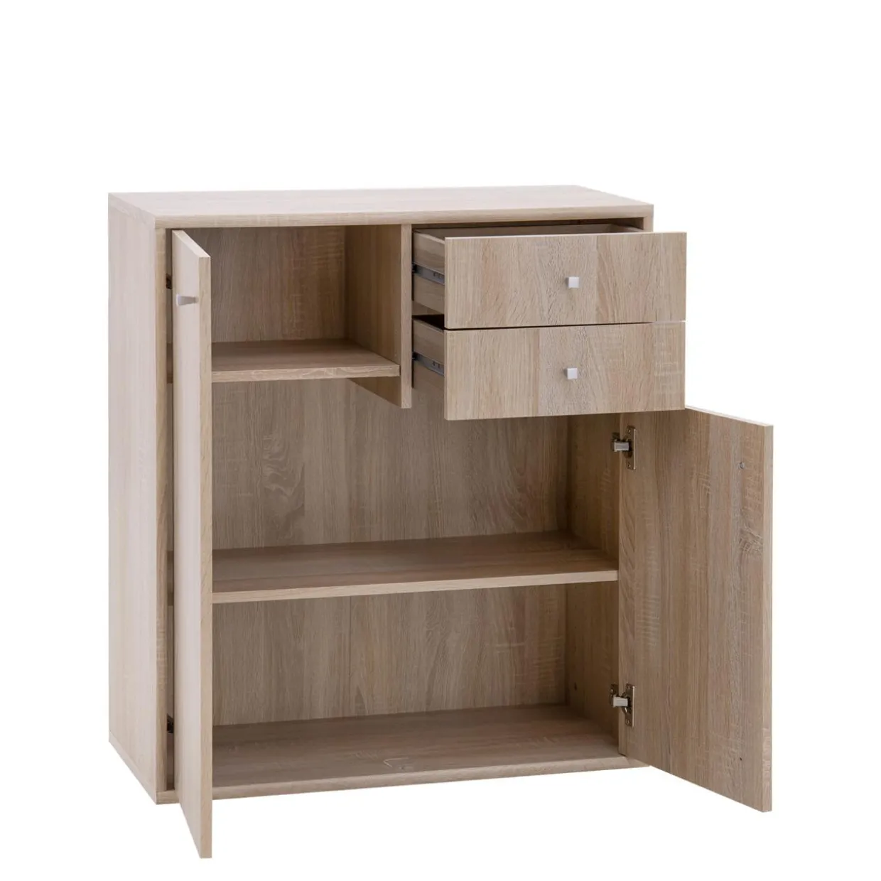 Doskonałym przykładem wykorzystania tej przestrzeni jest model komody wyposażony w 2 drzwi oraz 2 szuflady, w całości wykonany z płyty meblowej i wykończony folią.