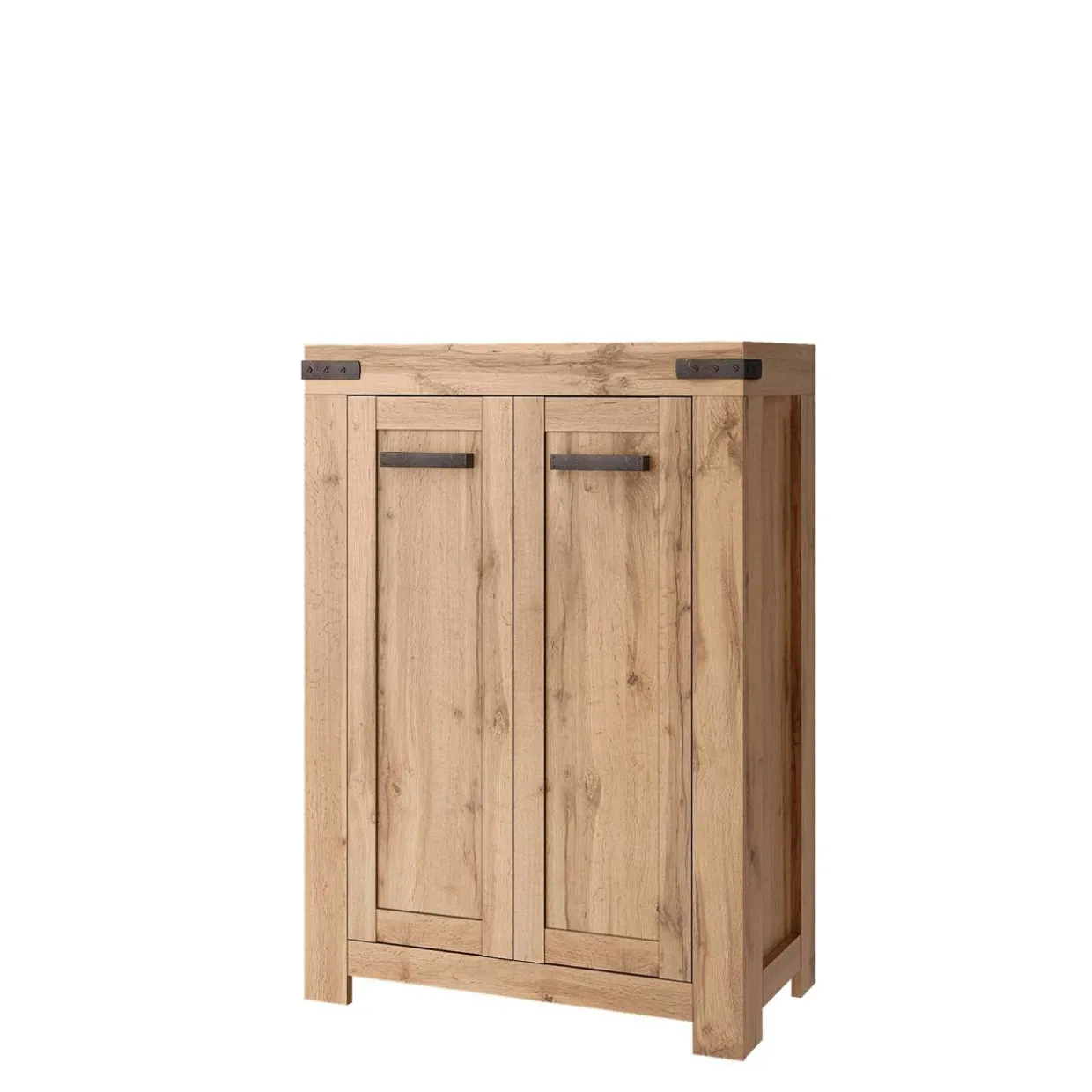 - Korpus, półki oraz fronty komody wykonane są z płyty meblowej, pokrytej laminatem w kolorze naturalnego drewna.