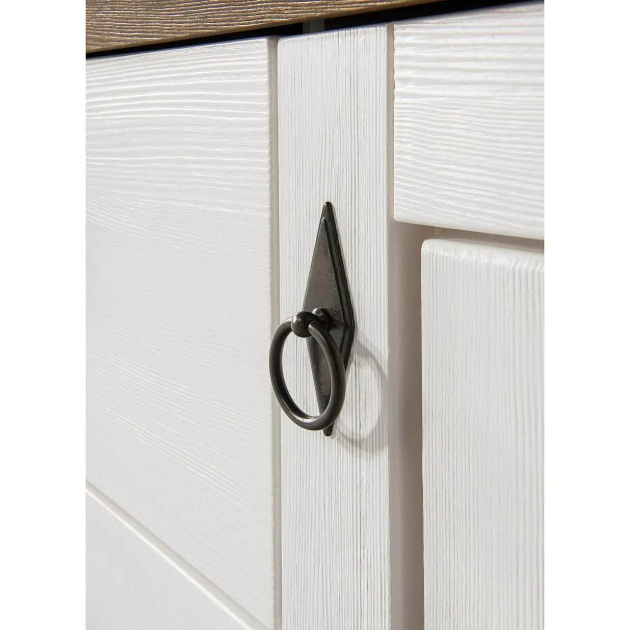 - Charakter bryły oraz styl kolekcji podkreślają uchwyty w formie postarzonych, metalowych kołatek.