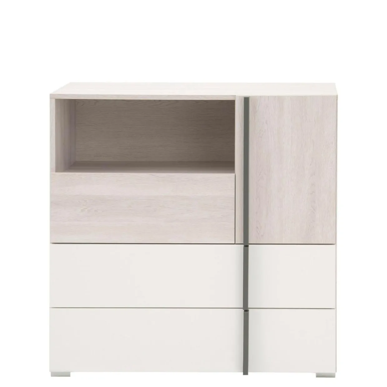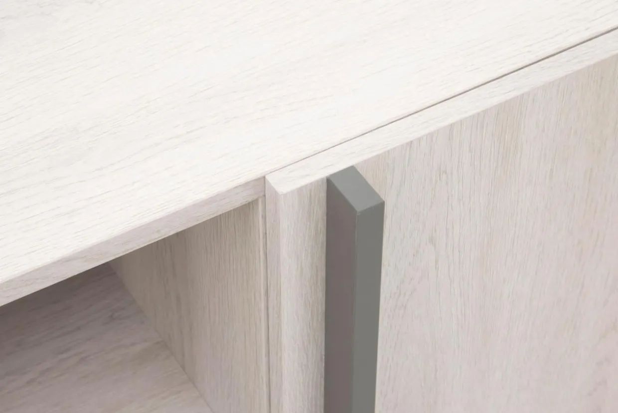 - Mebel pokryto laminatem w kolorze białego dębu Wilson, białego matu i antracytu.