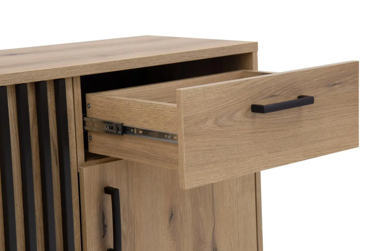 Połączenie laminatu imitującego drewno z czarnymi nóżkami i lamelami na froncie sprawia, że mebel odnajdzie się we wnętrzach urządzonych w stylu nowoczesnym i japandi.