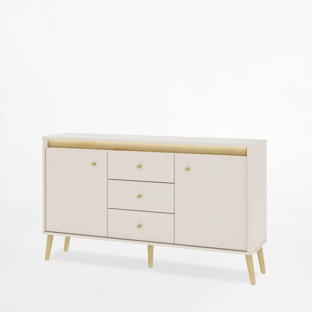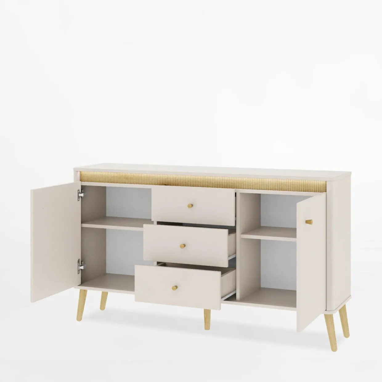 Komoda Lorena wykończona w eleganckim odcieniu kaszmiru z nóżkami w kolorze dębu, wprowadza do wnętrza przytulność i styl – doskonale sprawdzi się w salonie, jadalni lub sypialni