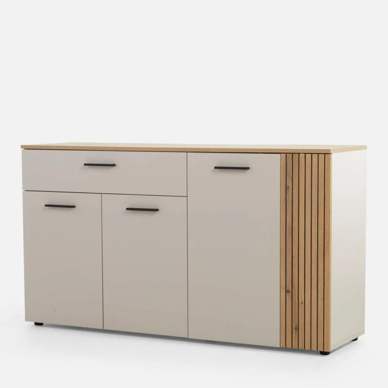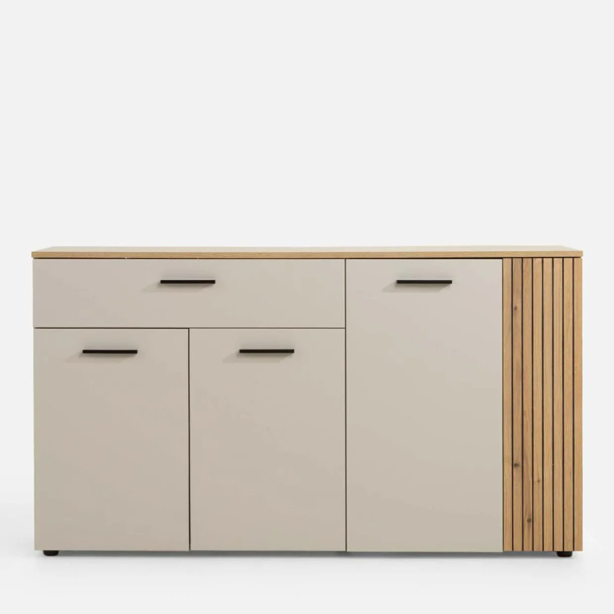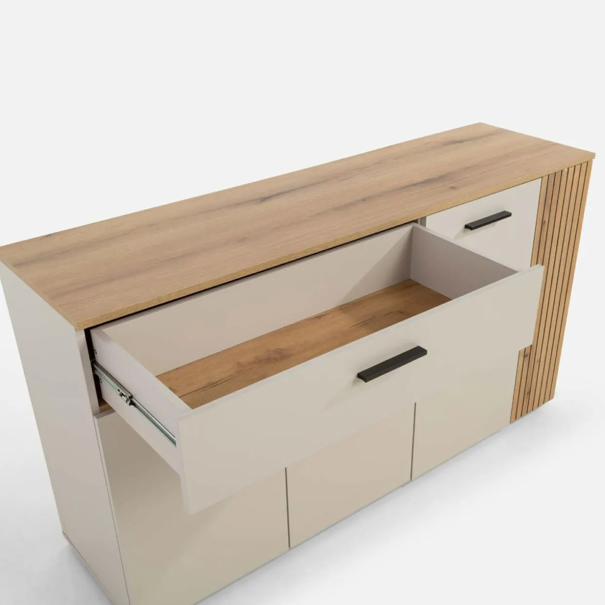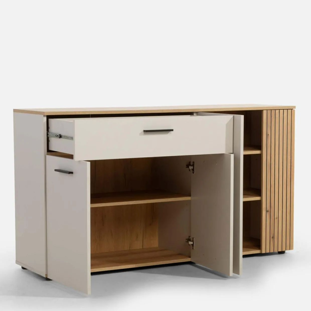 Zachowaj codzienny porządek w części jadalnianej z komodą FREZO. 2 szafki i szuflada pozwolą szybko znaleźć potrzebny przedmiot.