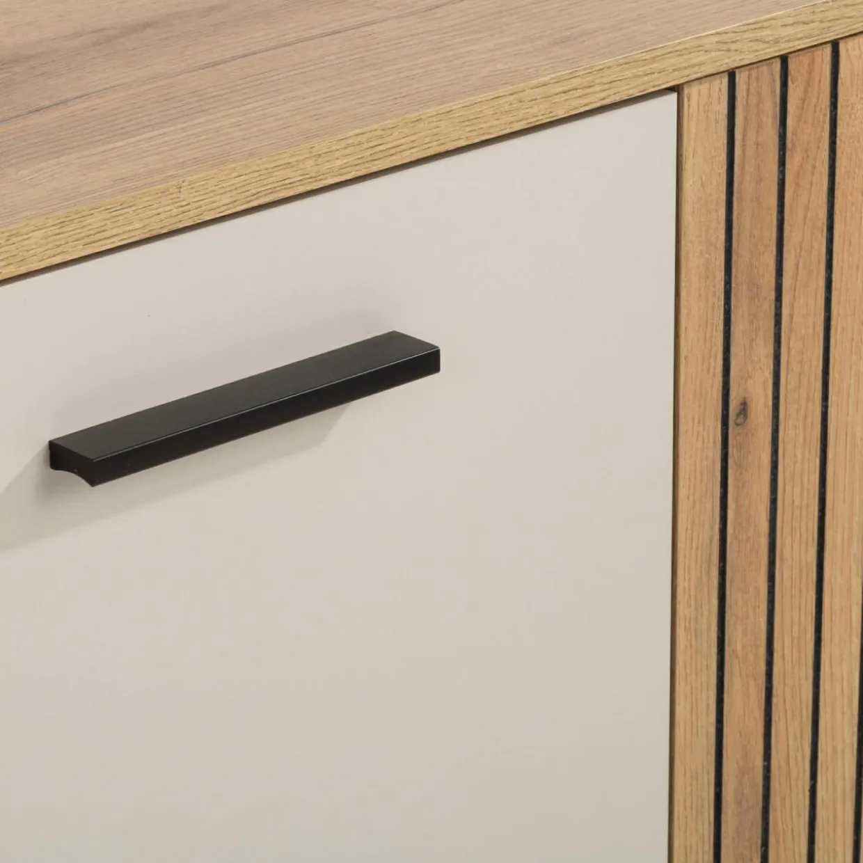 - Wykończenie w kolorze kaszmiru wprowadza elegancję i neutralność. Elementy z rysunkiem dębu evoke nadaje wnętrzu przytulny, naturalny akcent.