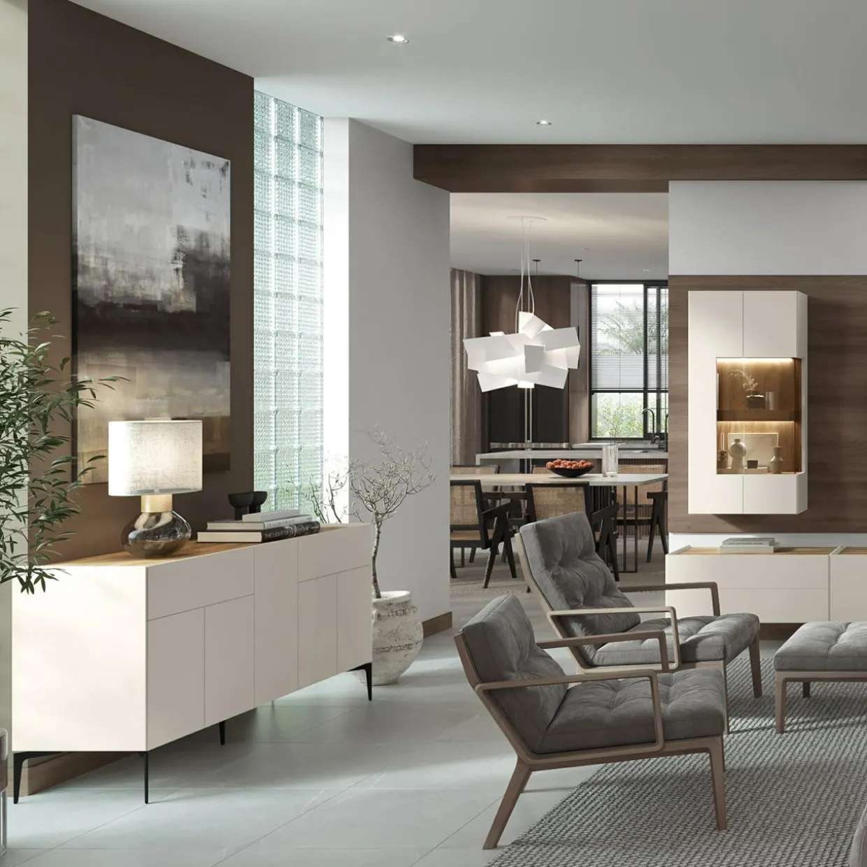 Kolekcja SKY45 to nowoczesne meble w kolorze kaszmiru z ciepłymi akcentami dębu tobacco. Prosta forma, starannie dopracowane detale i opcjonalne oświetlenie LED sprawiają, że idealnie pasują do współczesnych wnętrz. System cichego domyku, pojemne szuflady i wysokie nóżki zapewniają wygodę użytkowania i łatwość utrzymania porządku.