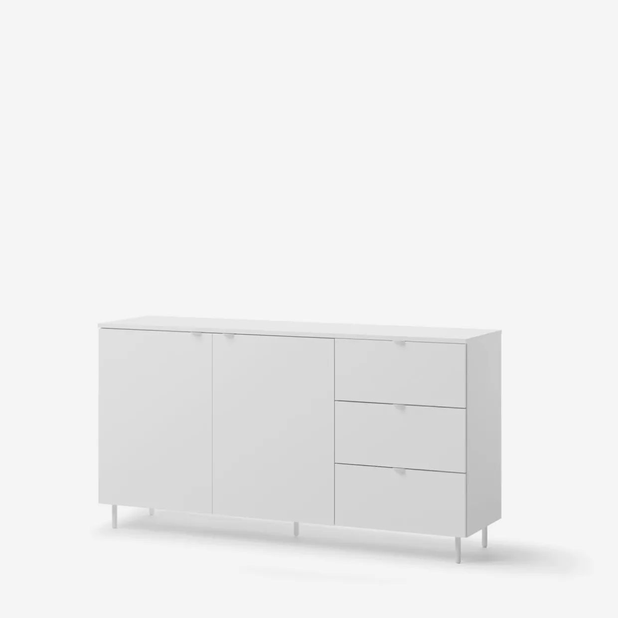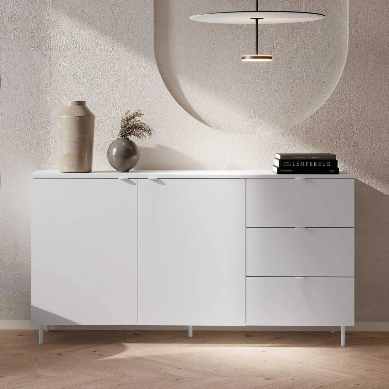 Komoda MILA w białym wykończeniu, idealnie uzupełniając wnętrza w stylu skandynawskim lub minimalistycznym. Doskonale komponuje się z jasnymi odcieniami drewna, szarością, beżem oraz akcentami czerni.