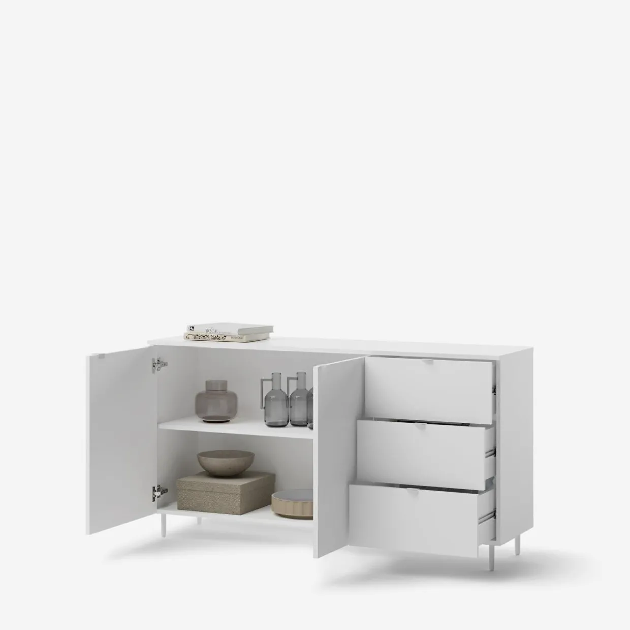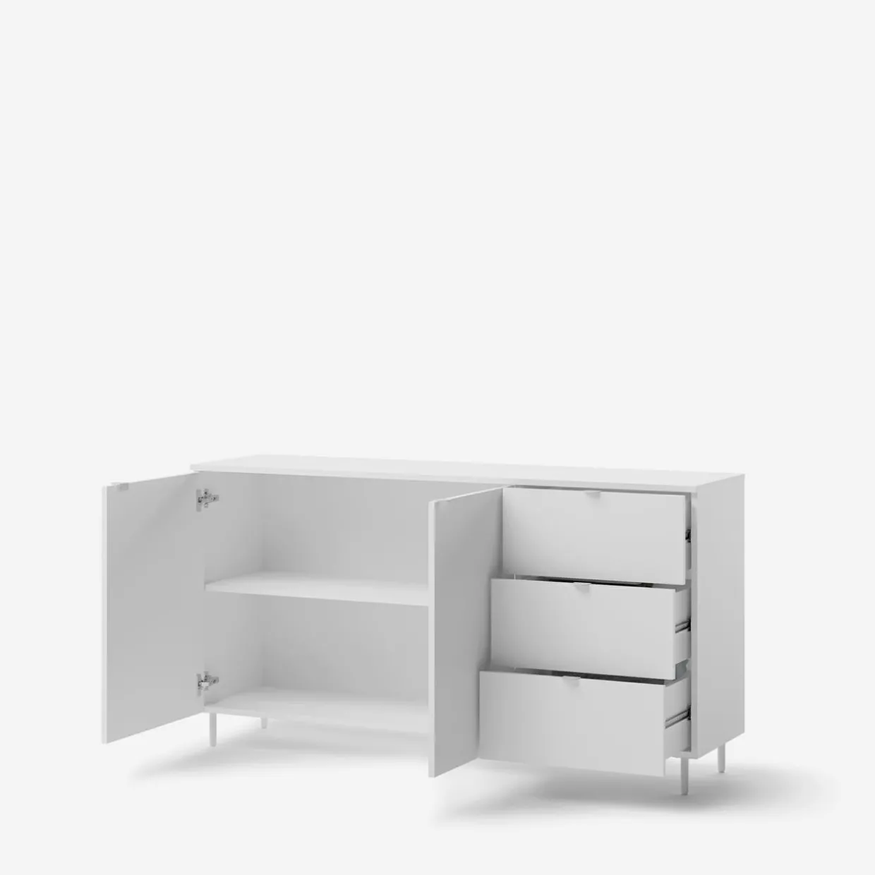 Nowoczesne meble do salonu i pokoju dziennego, wyróżniające się białym wykończeniem i metalowymi nóżkami. Minimalistyczny design i przemyślane detale sprawiają, że doskonale komponują się z jasnym drewnem, grafitem i pastelami, wprowadzając lekkość i estetykę do wnętrza.