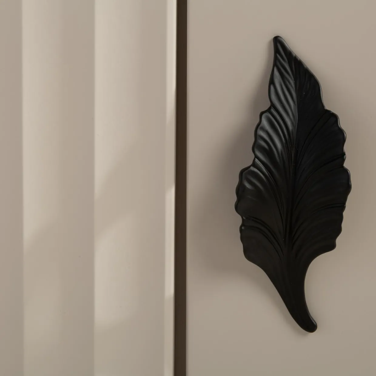 - Nietuzinkowe uchwyty z liściem pełnią rolę funkcjonalną, ale także stanowią ozdobę pomieszczenia. Ciemne, metalowe listki wyróżniają na tle frontów w odcieniach savany i kaszmiru.