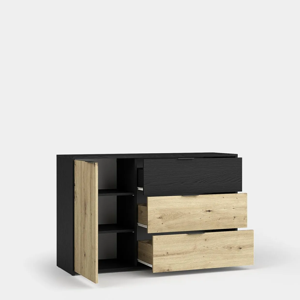 - Meble charakteryzuje wykończenie w odcieniu czarnego grafitu. Ciemną i elegancką kolorystykę dopełnia rysunek drewna.