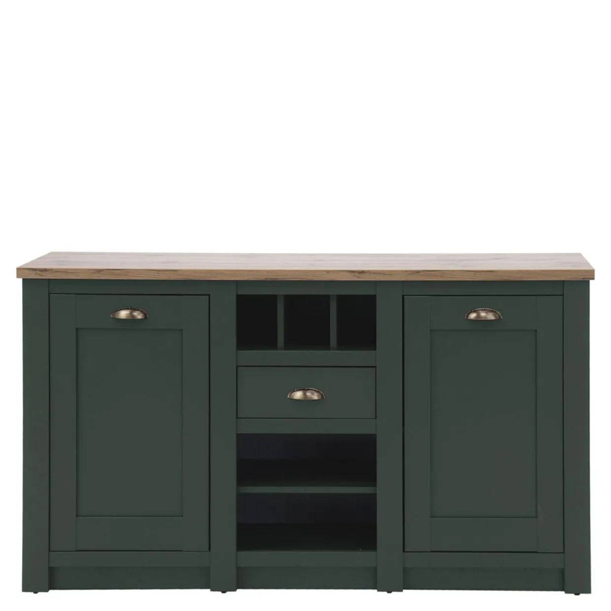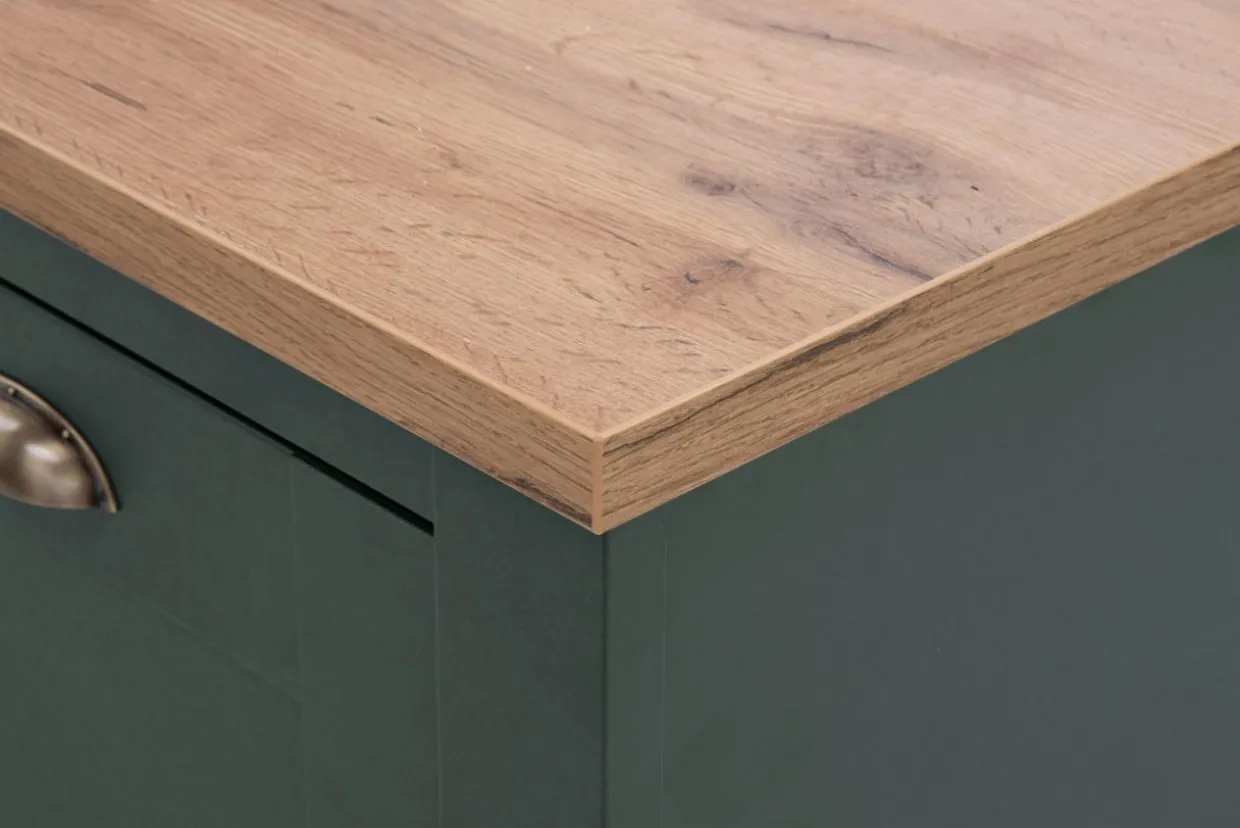 Postaw na wyjątkowe meble w ciemnozielonym kolorze, które połączone z blatem imitującym naturalne drewno wprowadzą do niego przytulny, a zarazem elegancki klimat.
