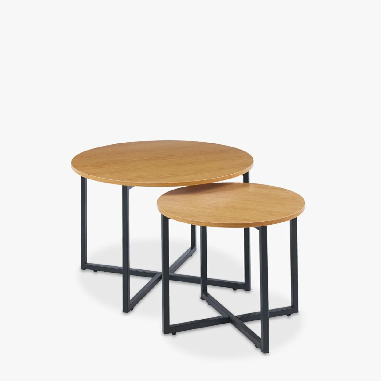 Komplet 2 okrągłych stolików KARMONY odnajdzie się w salonie, zapewniając Ci miejsce do pracy z laptopem czy na zjedzenie szybkiego lunchu. Prosta konstrukcja stolików oraz ich metalowe krzyżowane nogi podkreślą nowoczesny i loftowy styl wnętrza.