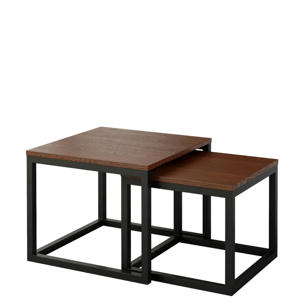 - Kwadratowe blaty z naturalnego ciemnego drewna wykończonego lakierem zostały połączone z metalowymi nóżkami o geometrycznym kształcie.