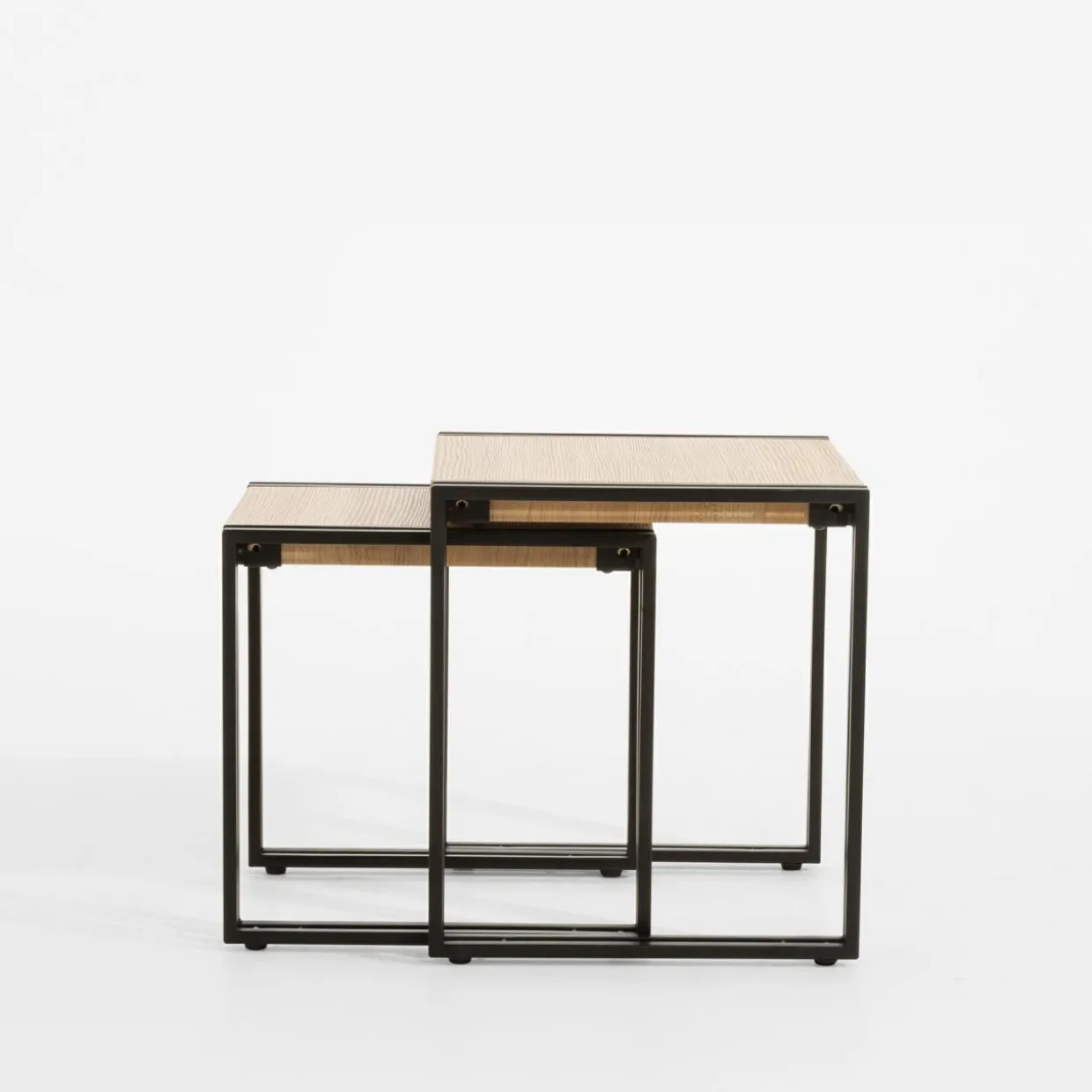 Komplet 2 stolików ORLO wpasuje się w industrialne i nowoczesne klimaty. Jasne barwienie blatu rozjaśni wnętrze. Ciekawe drabinkowe nogi w kształcie płóz będą ozdobą salonu samą w sobie.