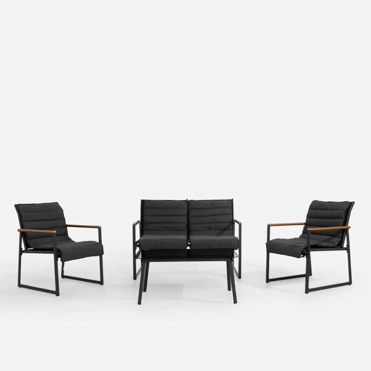 Komplet ogrodowy SOMEL ułatwi organizację spotkań na świeżym powietrzu. Zaproś gości, usiądą na sofie i 2 fotelach, a Ty podasz przekąski i napoje na prostokątnym stoliku.
