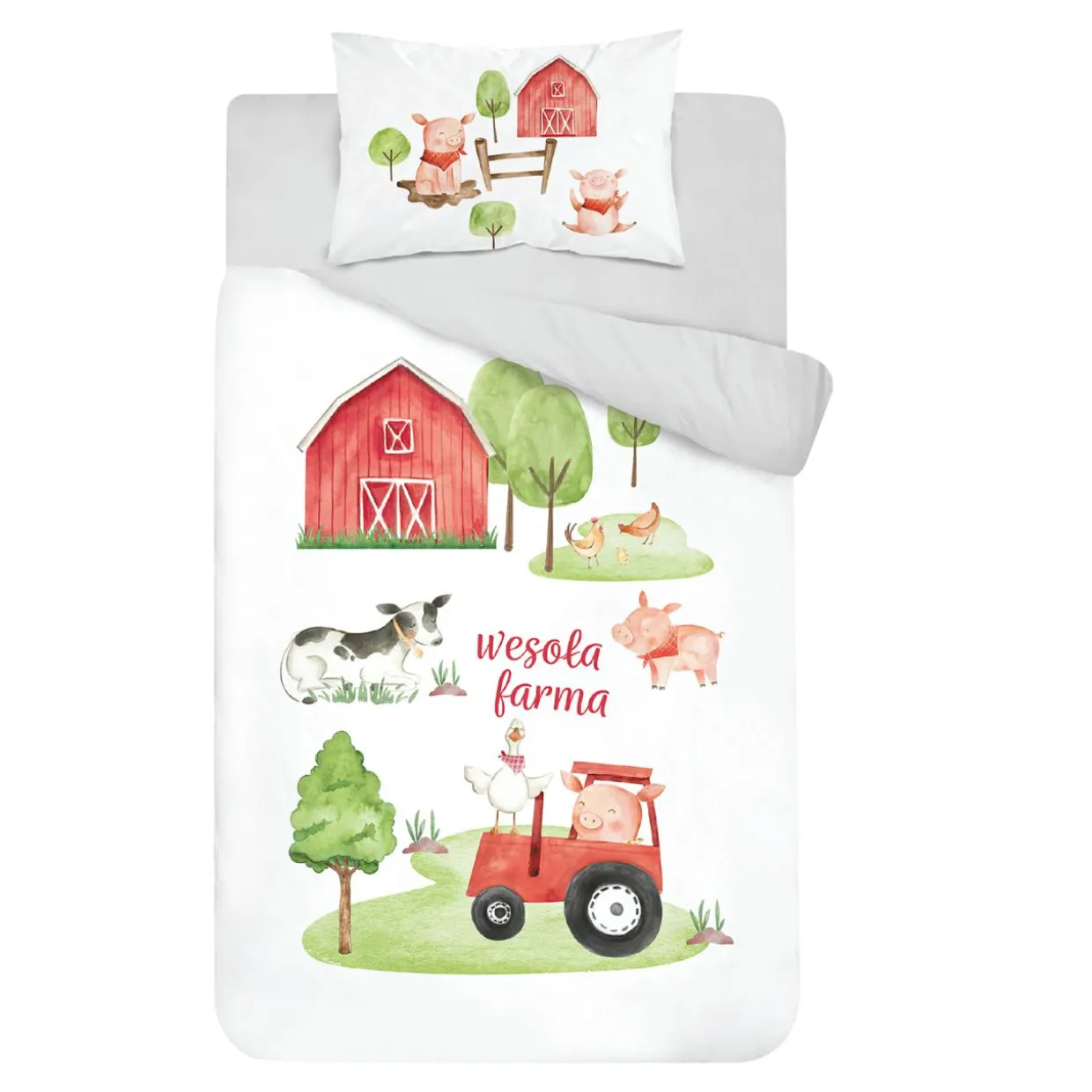 - Pościel jest dwustronna. Strona z białym tłem przedstawia scenkę rodzajową z życia na farmie. Jest konik siedzący w traktorze razem z gąską – na pierwszym planie, jest krówka i świnka – na drugim planie. Trzeci plan ukazuje stodołę, obok kurki skubią trawę. Wyobraź sobie, jak rozmawiasz z dzieckiem o tym wszystkim przed zaśnięciem. Twoja pociecha będzie mieć piękne i kolorowe sny.