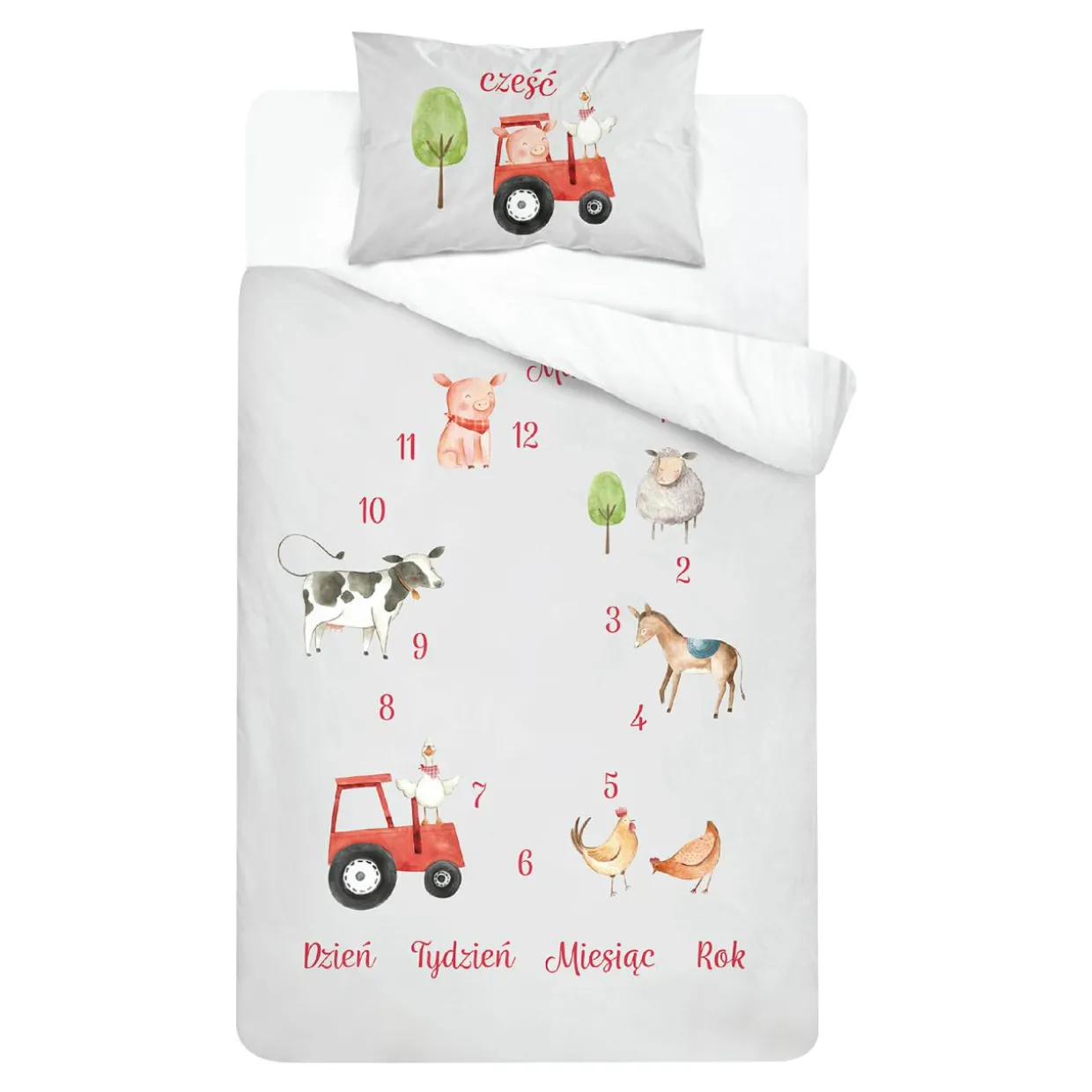 - Druga strona pościeli utrzymana jest w szarej kolorystyce. Znajdują się na niej cyferki od 1 do 12 ułożone niczym na tarczy zegara. Między cyframi widoczne są zwierzęta żyjące na farmie – owieczka, konik, kurka, gąska siedząca na traktorze, krówka i świnka. Wykorzystaj napisy widoczne na dole pościeli: dzień, tydzień, miesiąc, rok do zabawy z dzieckiem: „Mam już…” – odrobina śmiechu i urozmaicenia rutyny przed snem korzystnie wpłynie na nocny wypoczynek Twojego bąbelka.