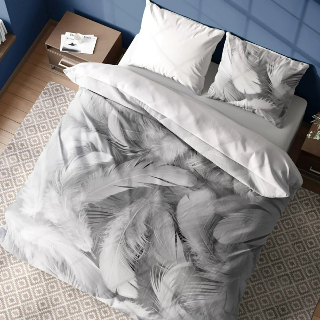 Wzór białych piórek na szarym tle sprawdzi się, jeśli pragniesz wprowadzić styl boho do swojej sypialni.