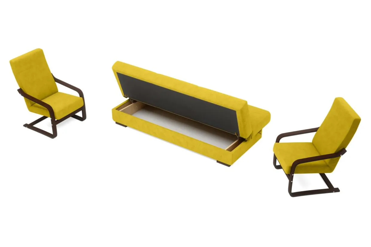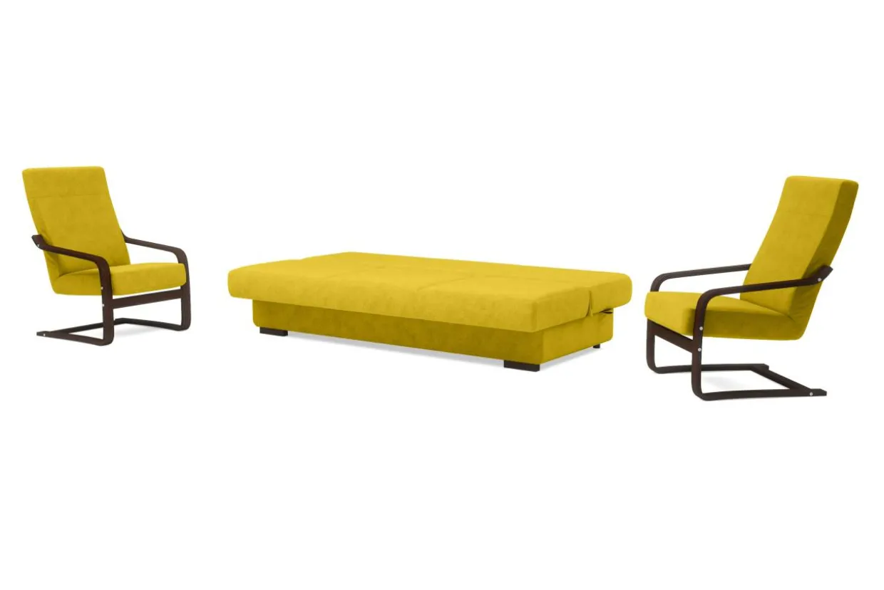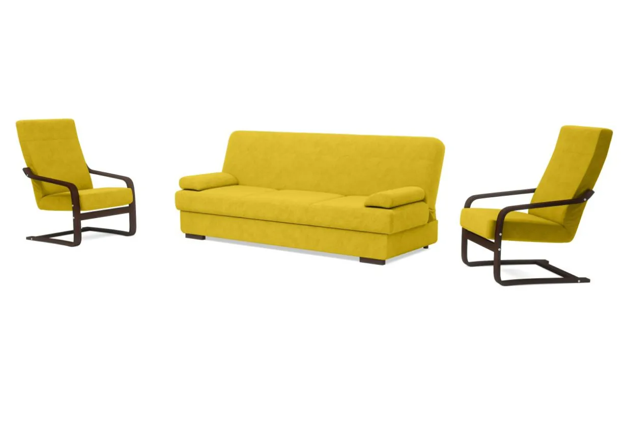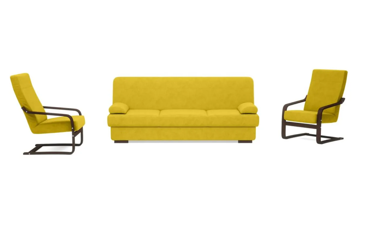 Stelaż do foteli został wykonany z drewna bukowego dzięki czemu jest naturalny, elastyczny i trwały. Cały komplet przeszyto tkaniną ALFA, trwałą i przyjemną w dotyku. W wersalce o komfort siedzenia dbają sprężyny faliste na siedzisku i oparciu. Wypełnienie foteli różni się od sofy. W fotelach wystarczy wypełnienie piankowe dzięki elastyczności drewnianego stelaża.