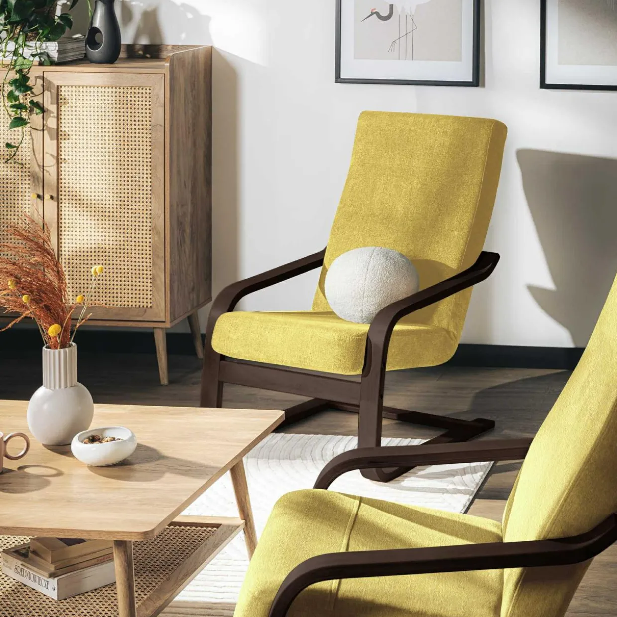 Bukowe drewno w z ciekawą tkaniną tworzą wspaniałe zestawienie.