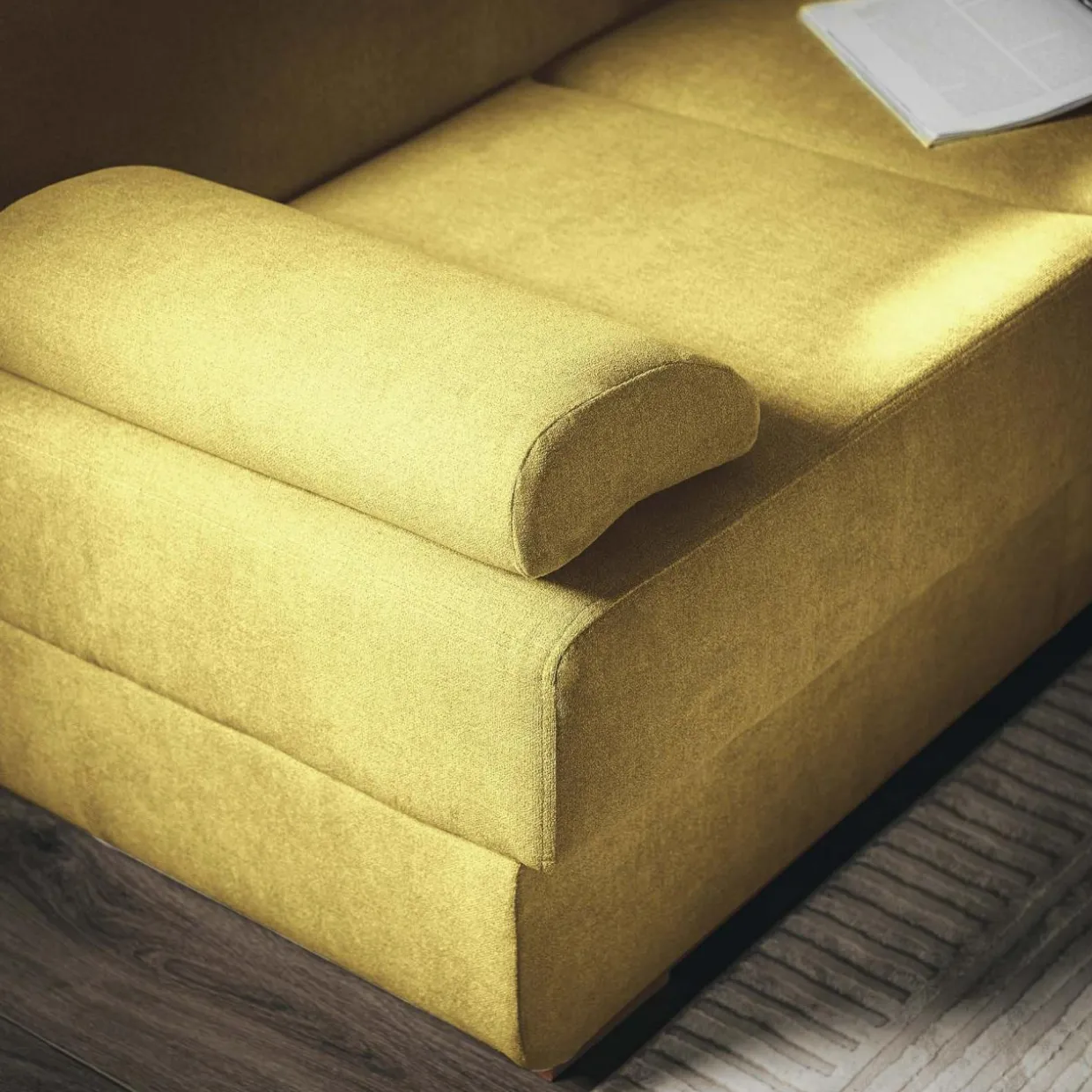 Pod siedziskiem znajdziemy pojemnik na pościel.