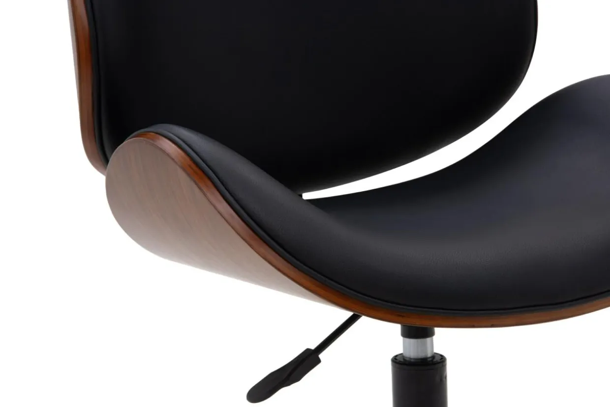 Tapicerka krzesła wykonana jest z ekologicznej skóry w czarnym kolorze. Eleganckie wykończenie krzesła biurowego doda klasy do pomieszczenia.