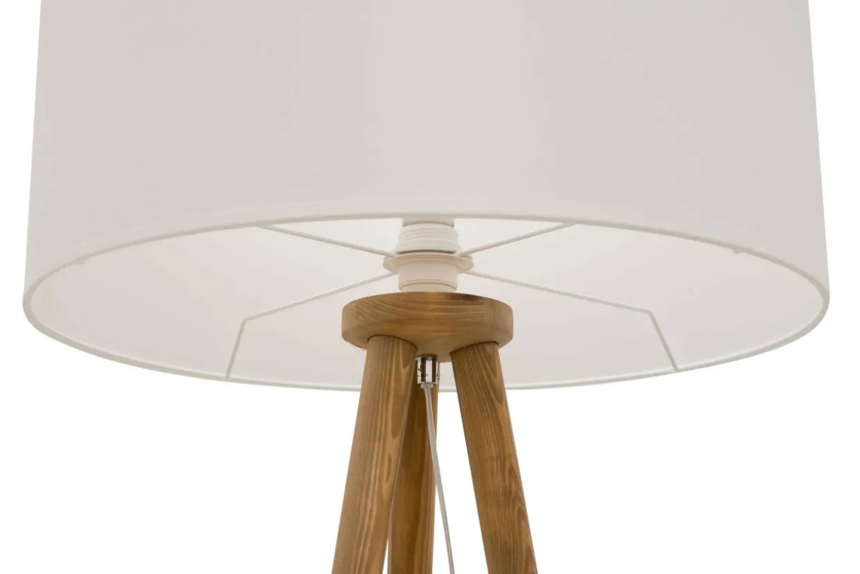 Górną część lampy zdobi abażur w kształcie szerokiego walca o średnicy 50 cm, wykonany z tkaniny o białym kolorze.