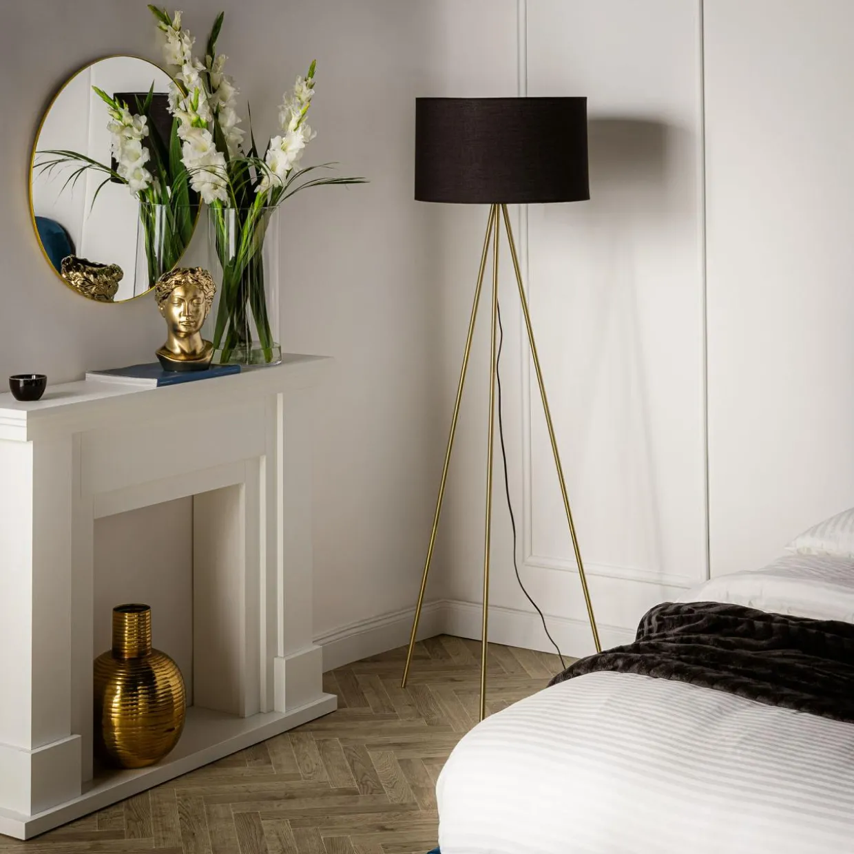 Przede wszystkim zwraca uwagę welurowe wykończenie oraz czarny kolor abażura, który doskonale współgra ze złotym wykończeniem trójnogu.