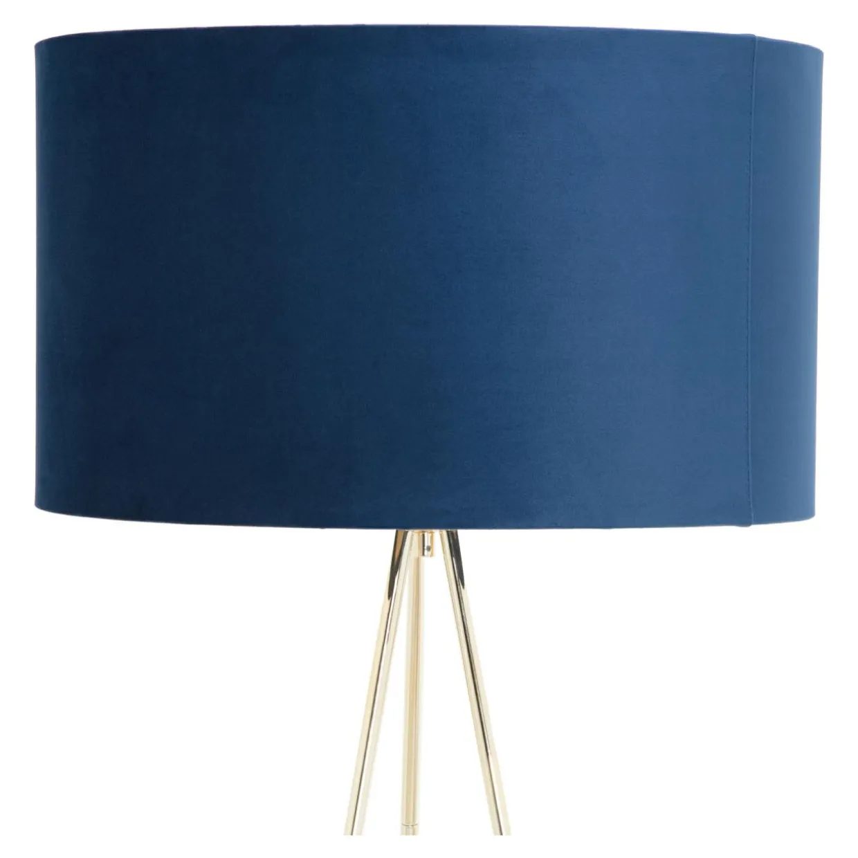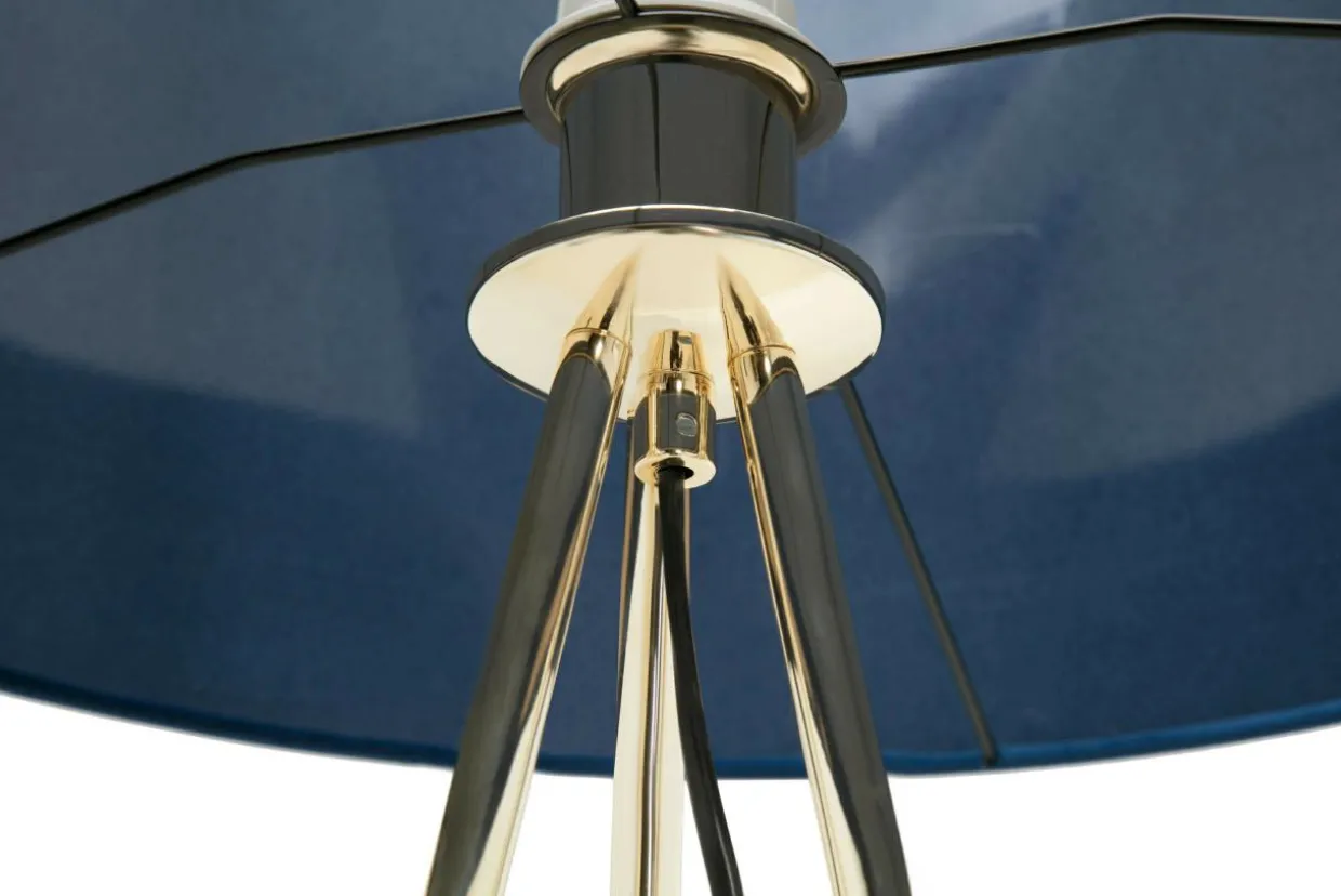 Przede wszystkim zwraca uwagę welurowe wykończenie oraz ciemny, niebieski kolor abażura, który doskonale współgra ze złotym wykończeniem trójnogu.