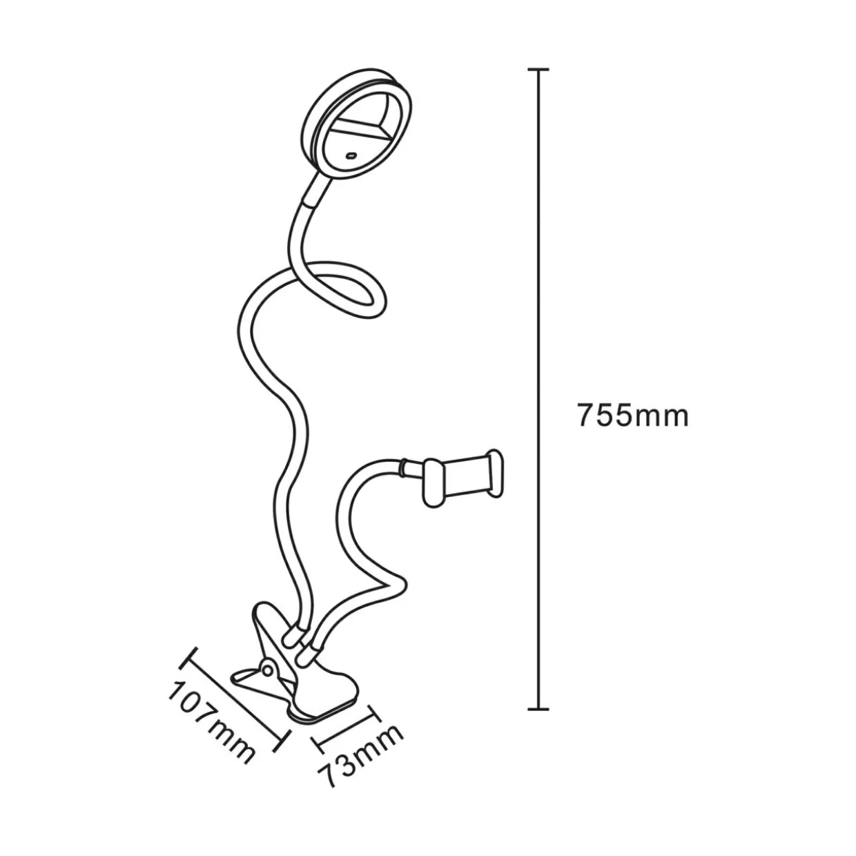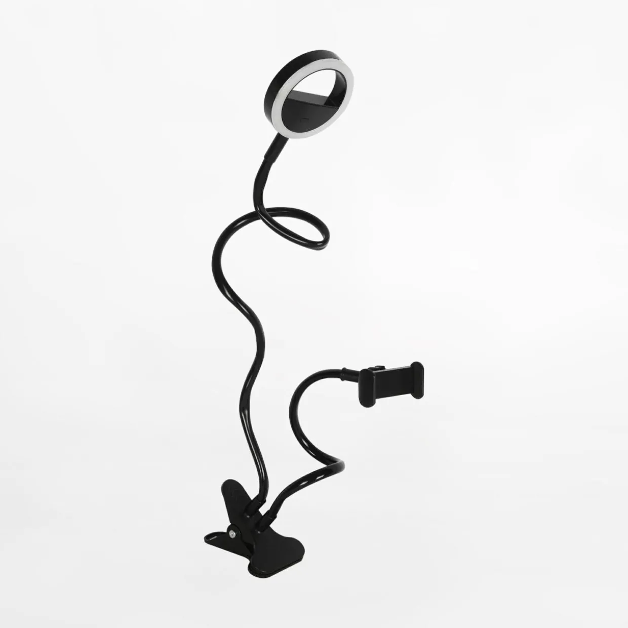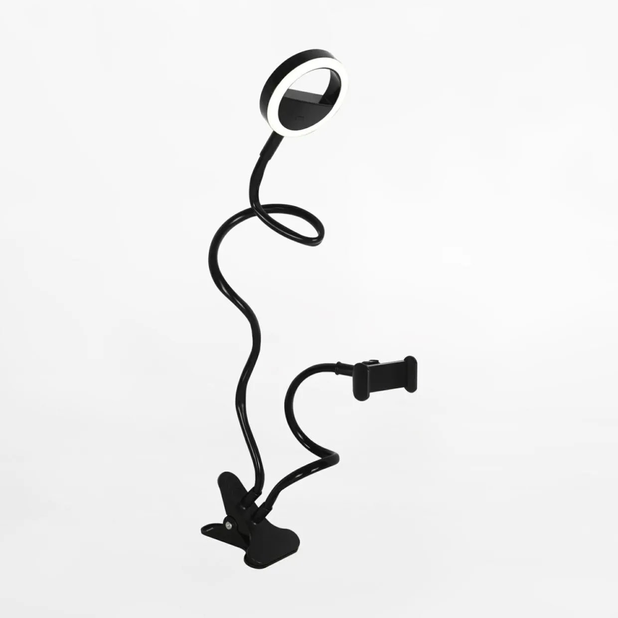 Lampa posiada klips mocujący do podłoża oraz 2 elastyczne ramiona. Jedno z podświetlonym LED pierścieniem, a drugie z uchwytem na smartfon.