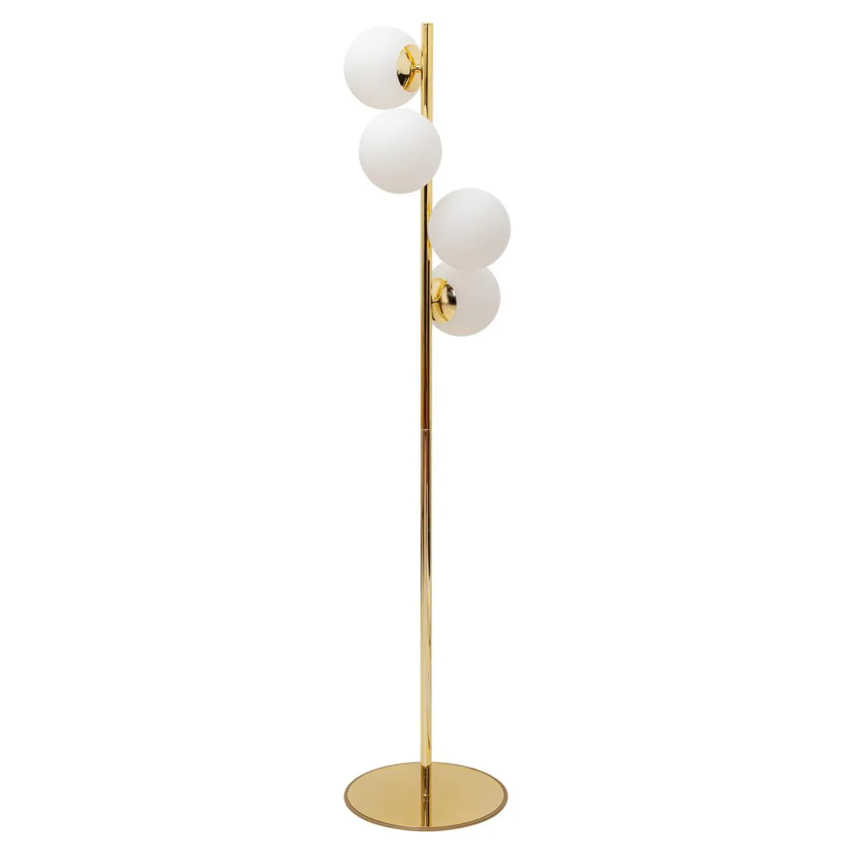 Jej charakterystyczne wykończenie w złotym kolorze i mleczno-białe klosze doskonale korespondują z meblami w odcieniach drewna, brązu, czerni i bieli.