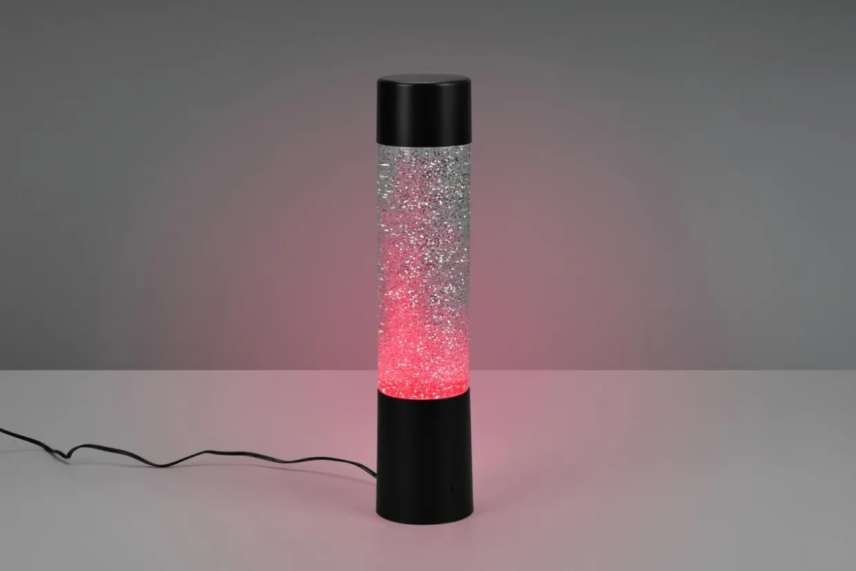 - Transparentny środek wypełniony jest cieczą, która po włączeniu lampy rozprasza się w setki świecących punkcików, które przypominają przesuwający się piasek.