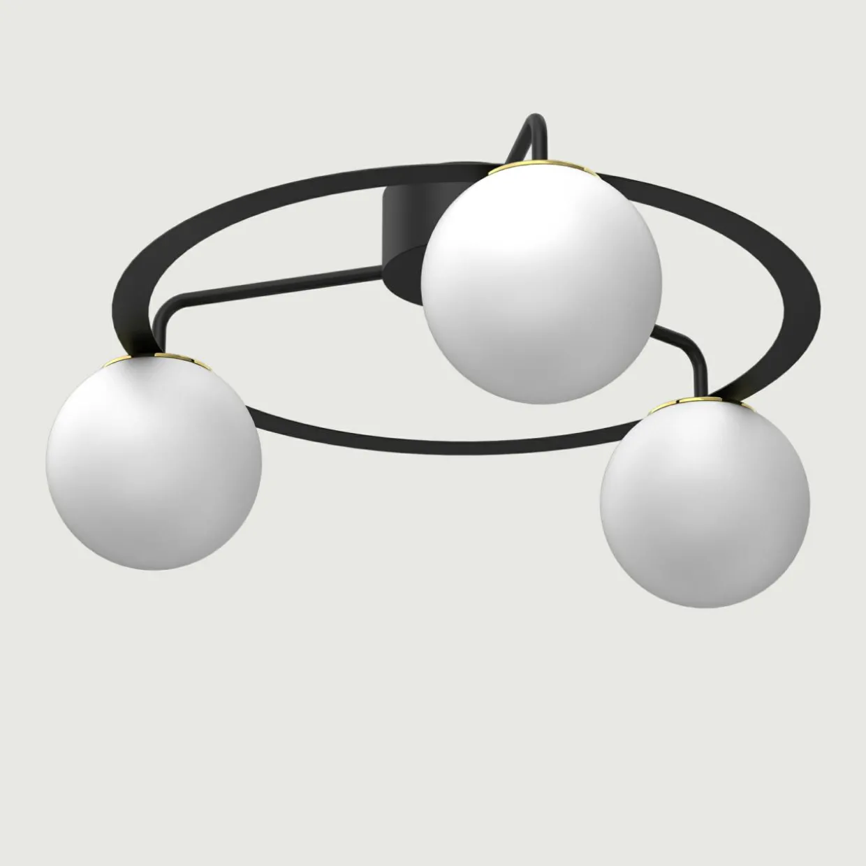 BALLO to kolekcja lamp w czarnej oprawie z białymi, kulistymi kloszami. W jej skład wchodzą: modele wiszące oraz sufitowe.