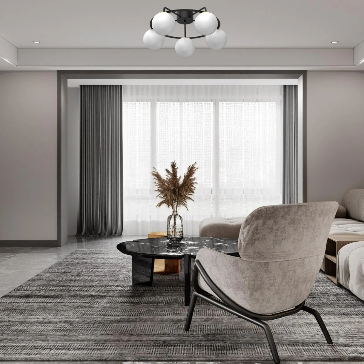 - Zestawienie czarnej oprawy z białymi kulami kloszy idealnie wpisuje się w przestrzeń salonu lub jadalni.